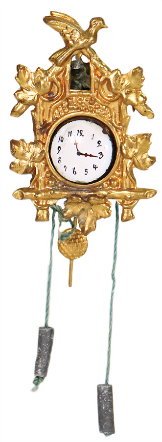Messingblech vergoldet, Kuckucksuhr, Ziffernblatt emailliert, 6 cm, Provenienz: „Sammlung Frohnwieser“