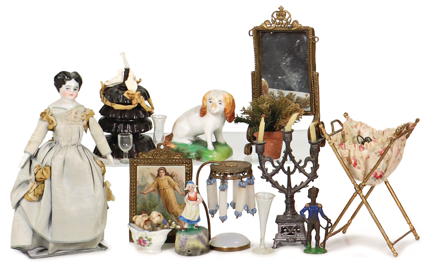 Puppenstuben-Puppe, Biedermeier, glasiertes Porzellan, Brustblattkopf, 11,5 cm, Kippspiegel, Nähkorb Zinn, Leuchter, Kleinteile, kl. Tischleuchter, Zinn, Glas montiert, Provenienz: „Sammlung Frohnwieser“