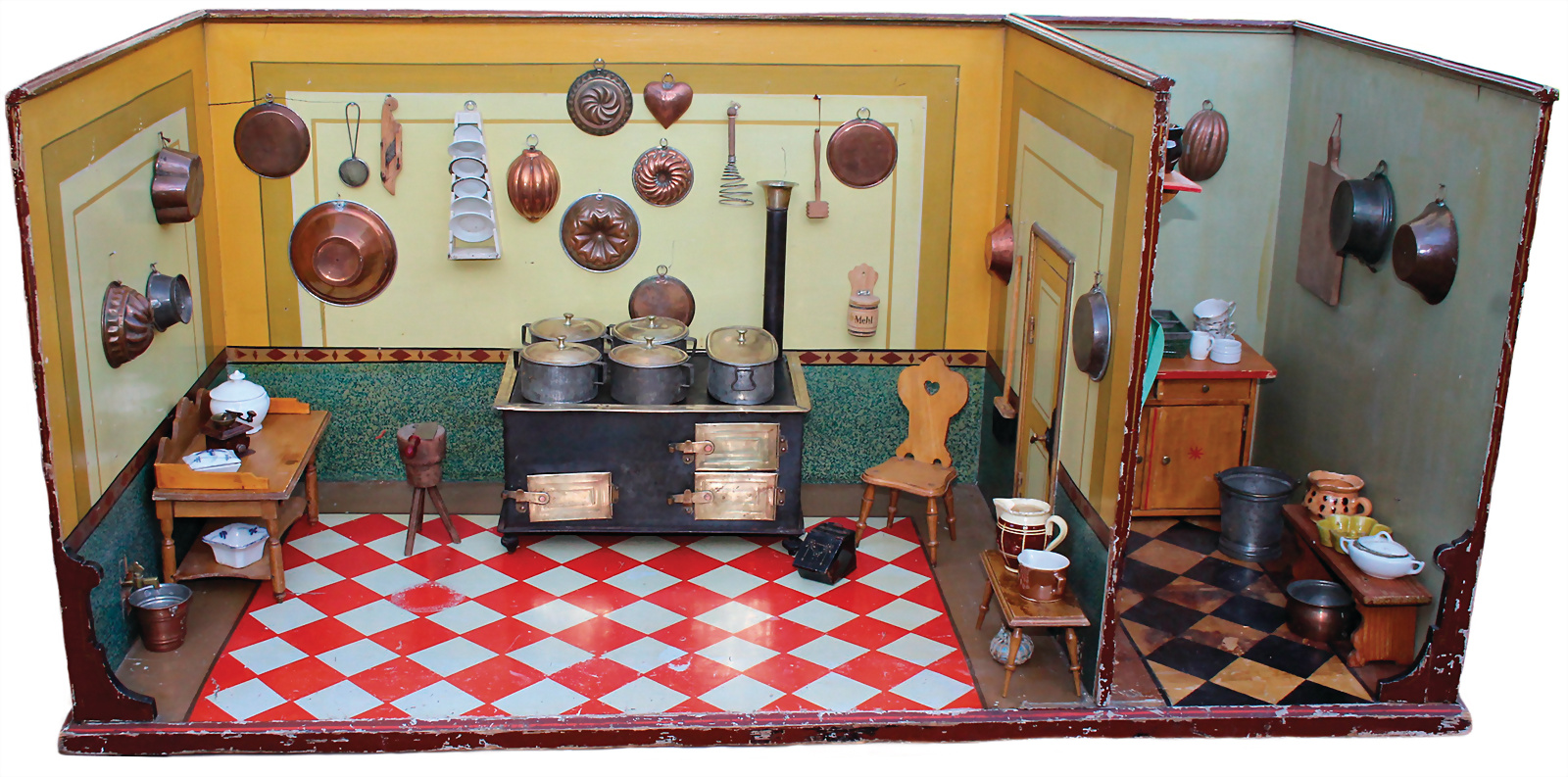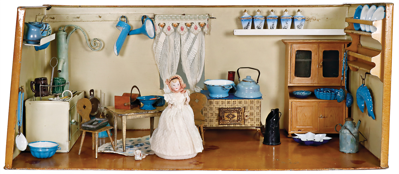 Puppenküche mit Vorratskammer, ca: 1890, schöne Orig.-Bemalung, Durchgangstür, möbliert, reichh. Zubehör mit Herd, H: 55 cm, T: 60 cm, B: 120 cm, nur an Selbstabholer