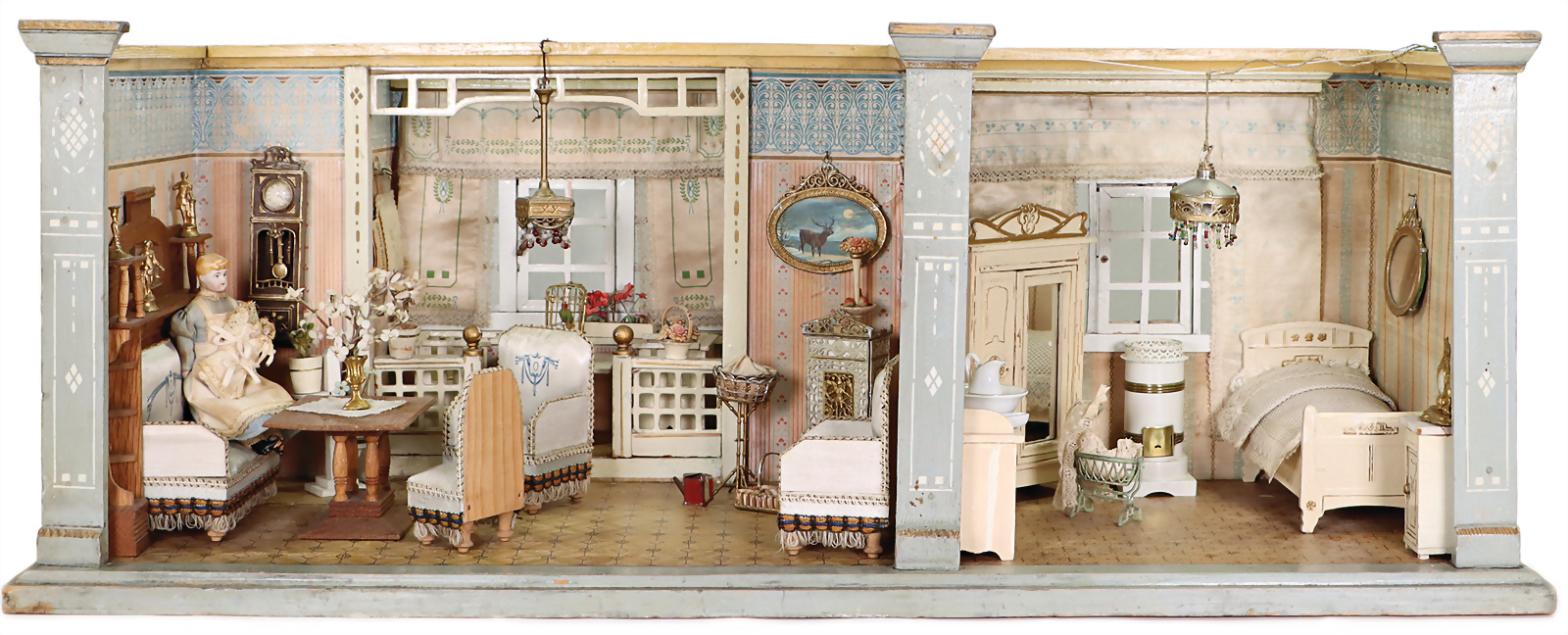 kleine filigrane 2-Zimmer Puppenstube von Moritz Gottschalk, um 1890, mit Erker und 6 Fenster, originale Jugendstil Tapete an Wand und Boden, sehr schönes taubenblaues gepolstertes Sitz-Mobiliar, sowie hochwertige Zinn- & Messing Blech vergoldete Dekor-Artikel, u.a. Vogelkäfig mit Wachspapagei, Zinn-Nähkorb, Hängelampen, 1 x Puppenstubenpuppe Haushälterin, B: 81 cm, T: 39 cm, H: 32 cm, Rissbildung am Boden