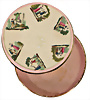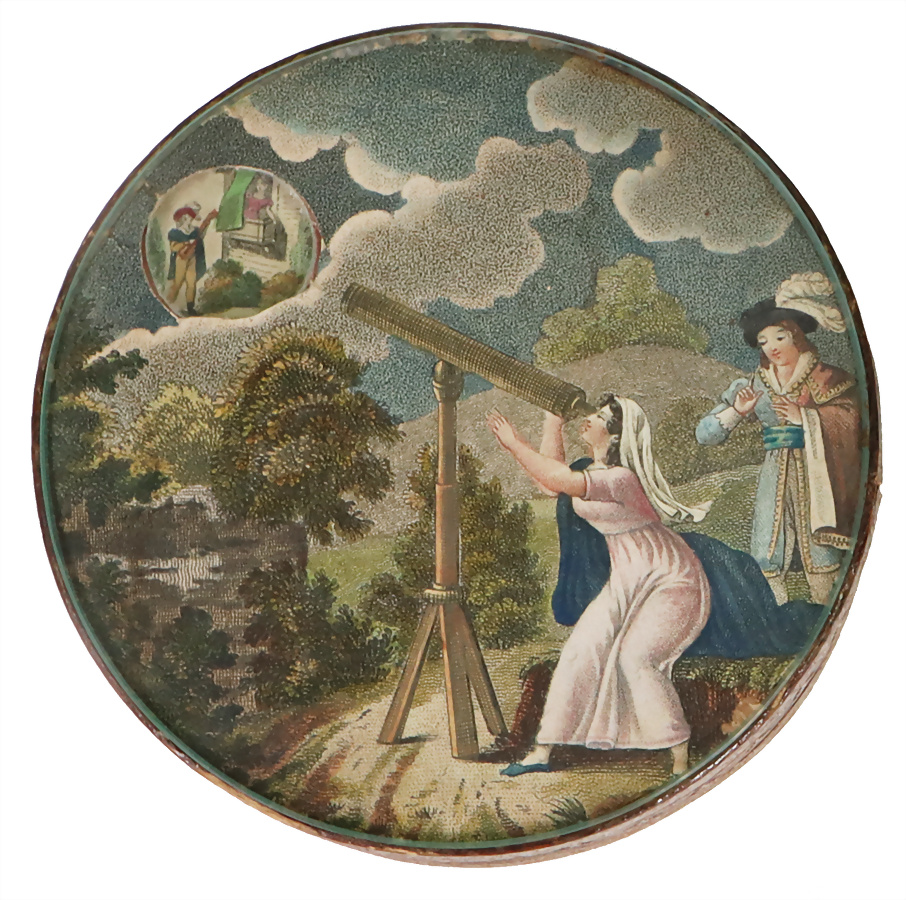 Runde frühromantische-Dekor-Dose, Ø10 cm, H: 3,5 cm, Aufbewahrung für Süßigkeiten, 1820/1830, eine Frau schaut durch ein Fernrohr, begleitet von einer weiteren Person – ein beliebtes Sinnbild für Wissenschaft, Entdeckung und Bildung, gemischt mit romantischer Naturdarstellung, das obere Glas dreht sich und gibt verschiedene Ansichten frei, sehr guter Zustand – selten, Herkunft: deutschsprachiger Raum