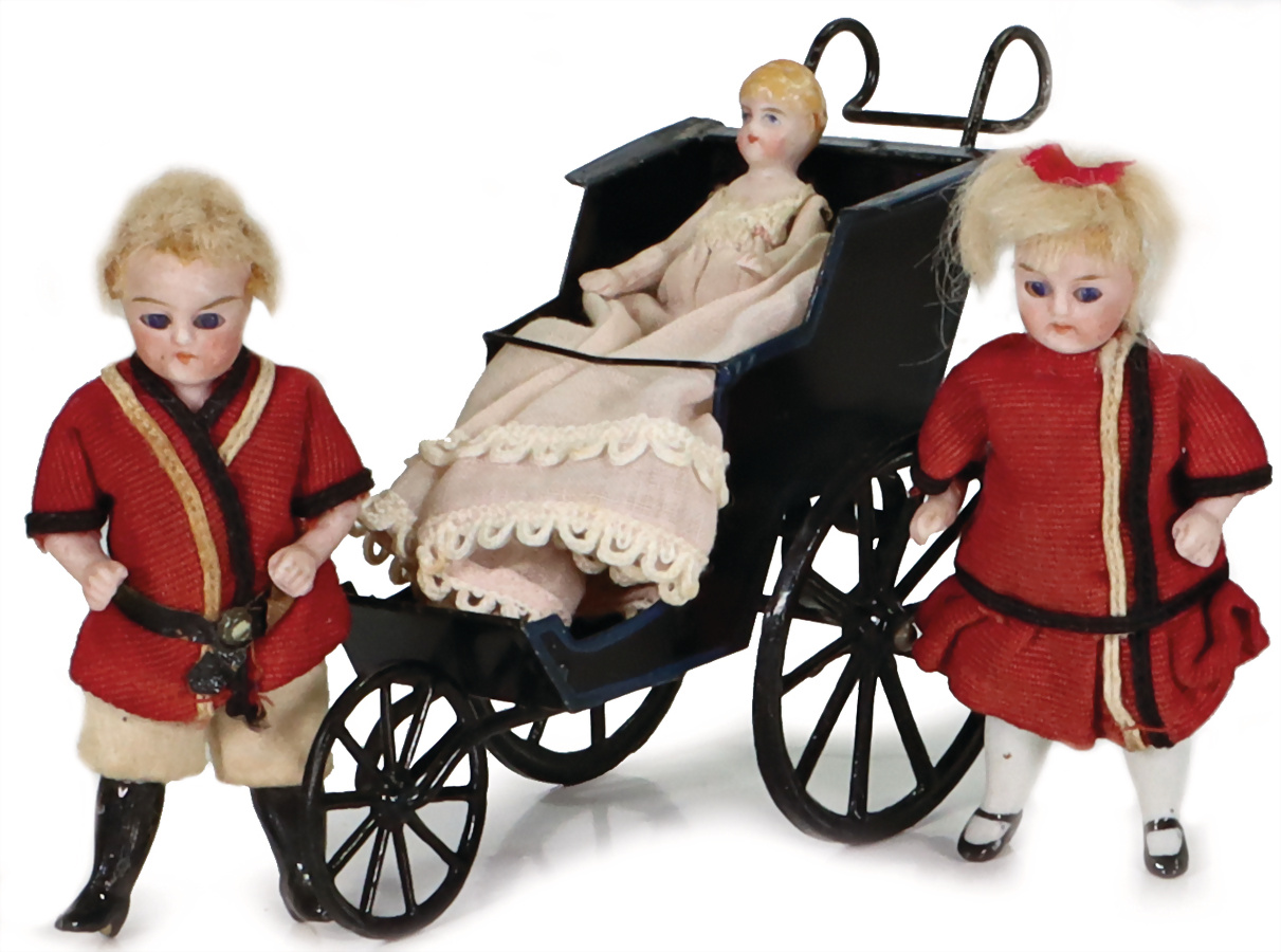 Puppenstuben-Puppen, 2 x Kinder, 10 cm, dreirädriger Kinderwagen, schwarz lackiert, teilw., farblich überarbeitet, L: 12 cm, H: 10 cm, kleine Ganzbiskuit Puppe