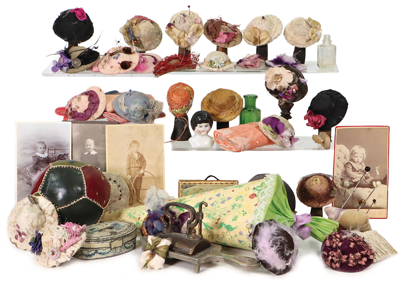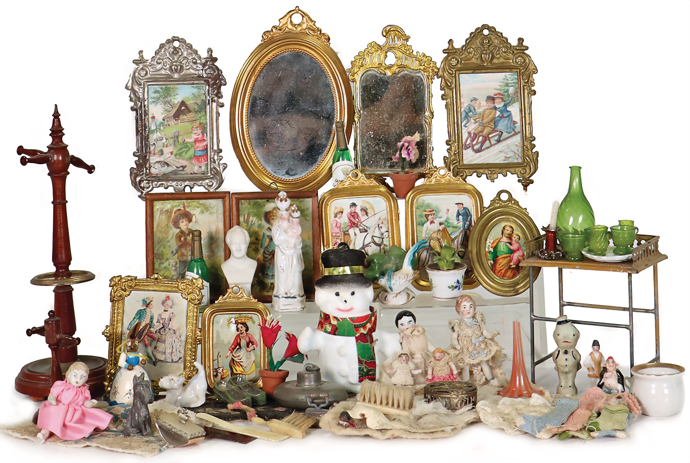 Puppenstuben-Ausschmückungsteile, Bilderrahmen, Messingblech, vergoldet, 2 kl. Ganzbiskuit-Puppen, Bärenfell, Zubehörteile, schönes Konv., Provenienz: " Sammlung Gerda Ott "