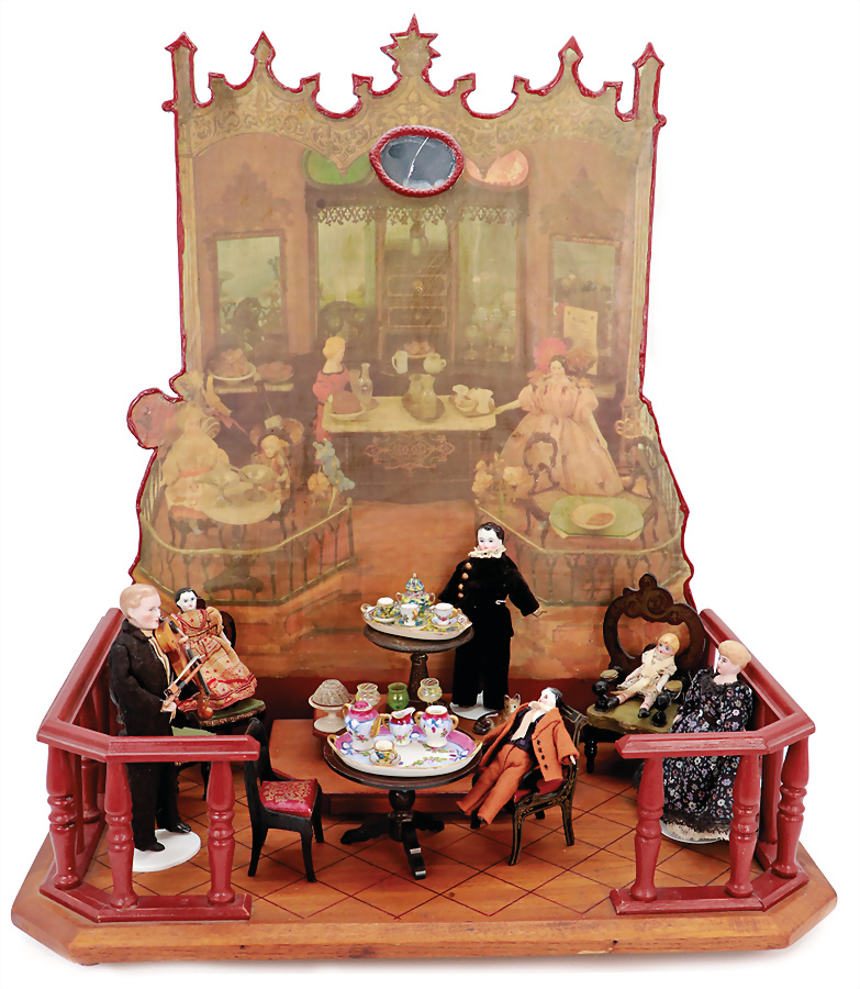 Café, auf Holzsockel, 45 x 27 cm, mit Holzgeländer, aufgesteckte Rückwand, Papier beklebt, mit kleinem Podest, Alter?, darin einige Möbelteile, Boule?, 2 Stühle mit kleinem rundem Tisch, Wachstuch bezogen, mit goldener Prägung und 1x 2 Stühle, 1 Sessel, stoffbezogen, dazu runder Tisch, H: 6,5 cm, 2x Porzellan Kaffeeservice, 1x gem. francais und 1x gem. LIMOGES , dazu 2 Biedermeier Brustblattkopf-Puppen, Stoffkörper, Porzellan-Arme u. -Unterschenkel, 9,5 cm und 1 Puppenstuben-Mann, Porzellan-Brustblattkopf, modell. Frisur, gemalte Augen, geschl. Mund, Stoffkörper, Porzellan-Arme u.-Unterschenkel mit anmodell. Schuhen, 16,5 cm, Filzanzug mit einer Geige, aufziehbares Spielwerk, nicht intakt, das Objekt befindet sich in der Schweiz, bei Einfuhr in die EU fallen Einfuhrumsatzsteuer u. Zollgebühren an