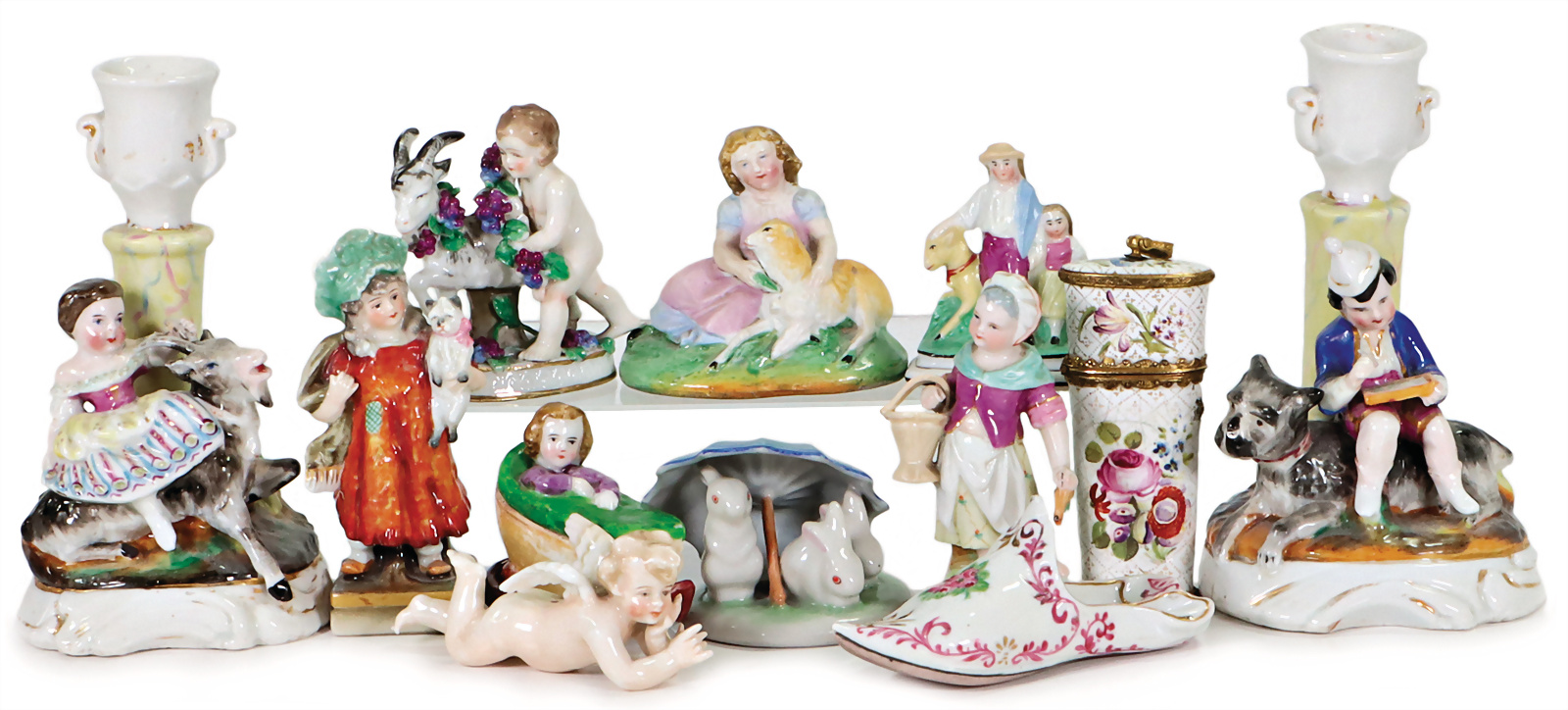 Konv. Porzellanfiguren, Junge mit Hund, Mädchen mit Ziegenbock, 13,5 cm, Porzellanschatulle mit Taschenmesser, Mädchen mit Krug, Engel, Provenienz: „Sammlung Frohnwieser“