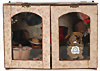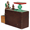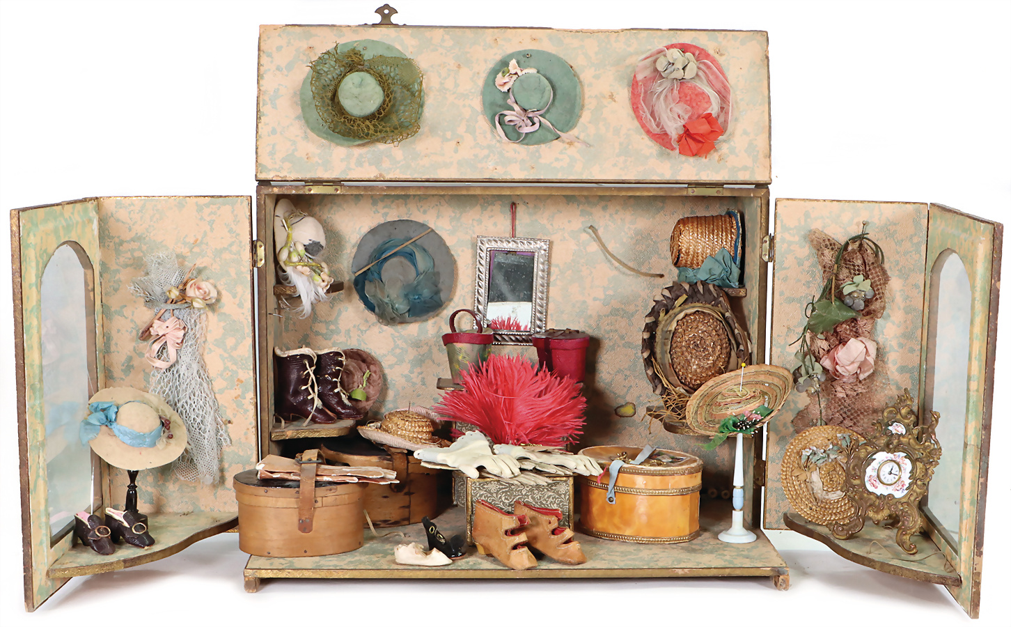 Puppenstuben-Hutladen, vorne u. oben aufklappbar, im geschl. Zustand, B: 36 cm, H: 26 cm, 1 Fensterglas gerissen, 1 paar Wasserflecken außen, Provenienz: „Sammlung Frohnwieser“