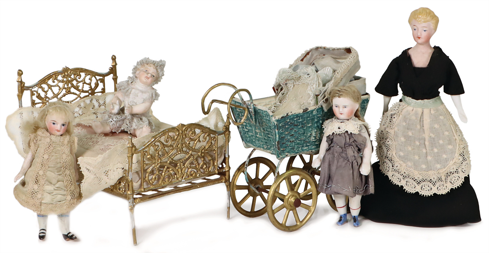 Puppenstuben-Ausschmückungsteile, Zinnbett, L: 12,5 cm, Haushälterin, 14 cm, Porzellan-Brustblattkopf, Porzellan-Arme, Stoffkörper, Beine fehlen, 2 Ganzporzellan-Kinder, Kinderwagen, 1 Kind Rock bestoßen, Provenienz: „Sammlung Frohnwieser“