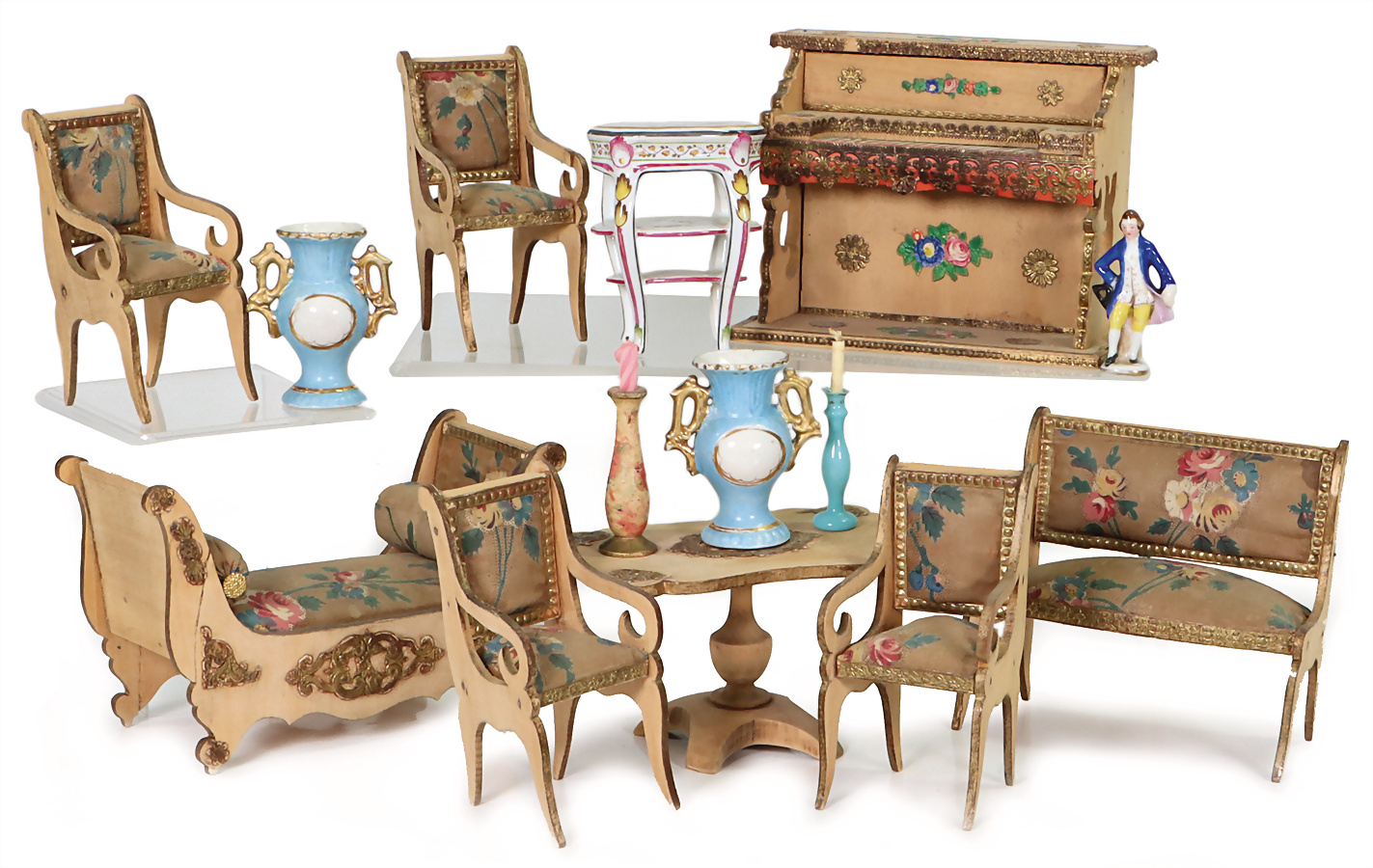 Puppenstuben-Möbel, Frankreich, Sitzgruppe, Klavier, B: 15 cm, H: 12 cm, 2 Vasen, einige Kleinteile, 1 Porzellan-Tisch, Provenienz: „Sammlung Frohnwieser“