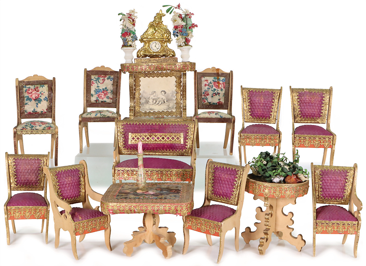 Puppenstuben-Möbel, Frankreich, Sitzgruppe, Sofa, 12,5 cm, B: 14 cm, Stühle mit 2 unterschiedlichen Bezügen, Tisch, Blumentisch, Kamin mit Vasen u. Kaminuhr, H: 20,5 cm, Provenienz: „Sammlung Frohnwieser“