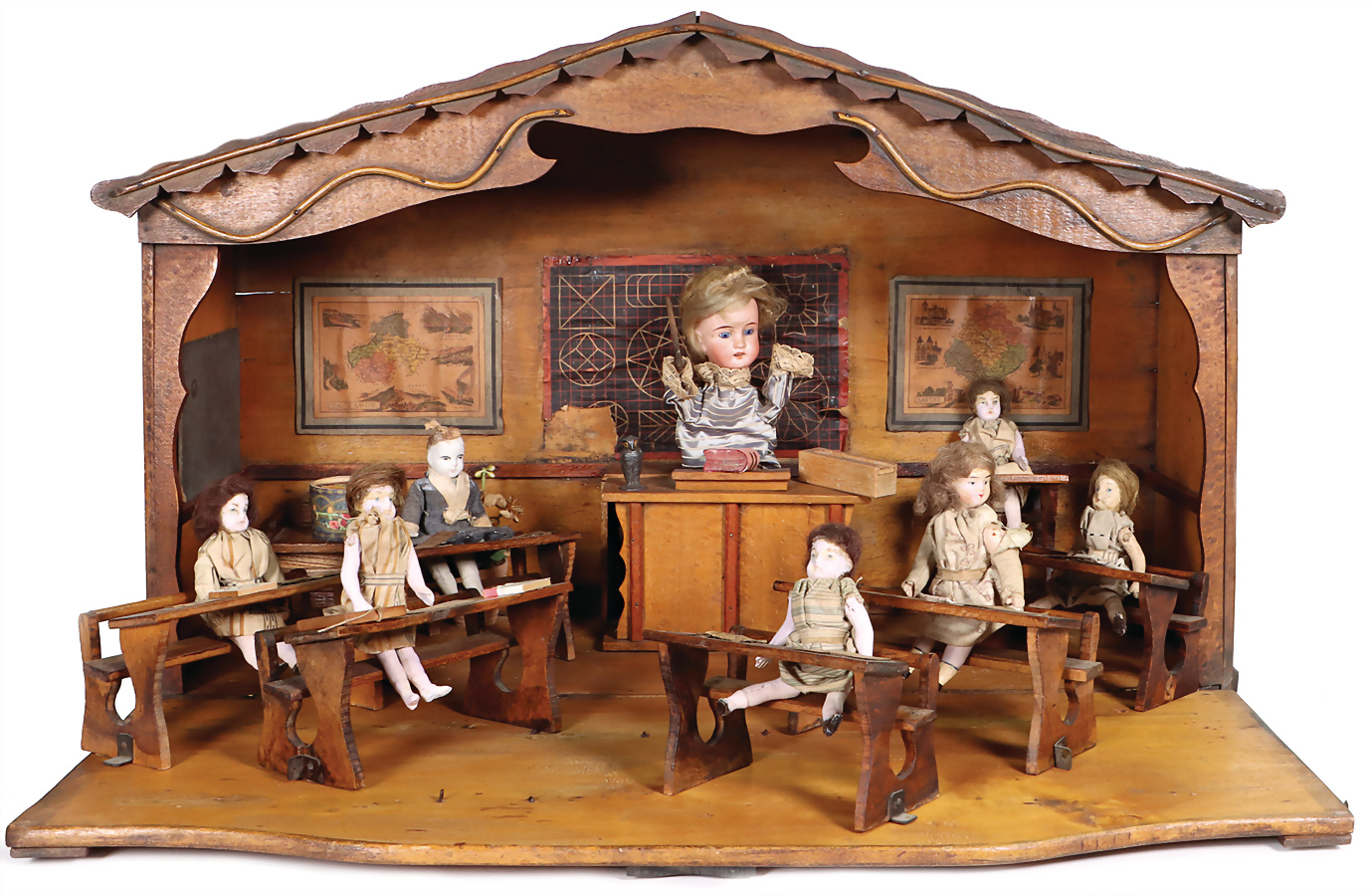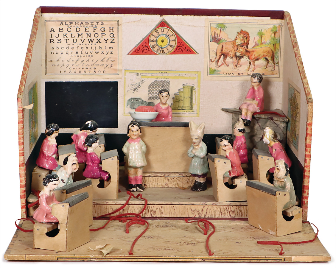 Puppenstuben-Schule, Automat, Frankreich, Puppe bewegt die Arme, mit Spielwerk (intakt), B: 54 cm, H: 34 cm, um 1900, Front aufklappbar, mit Puppen u. Dekorationsmaterial