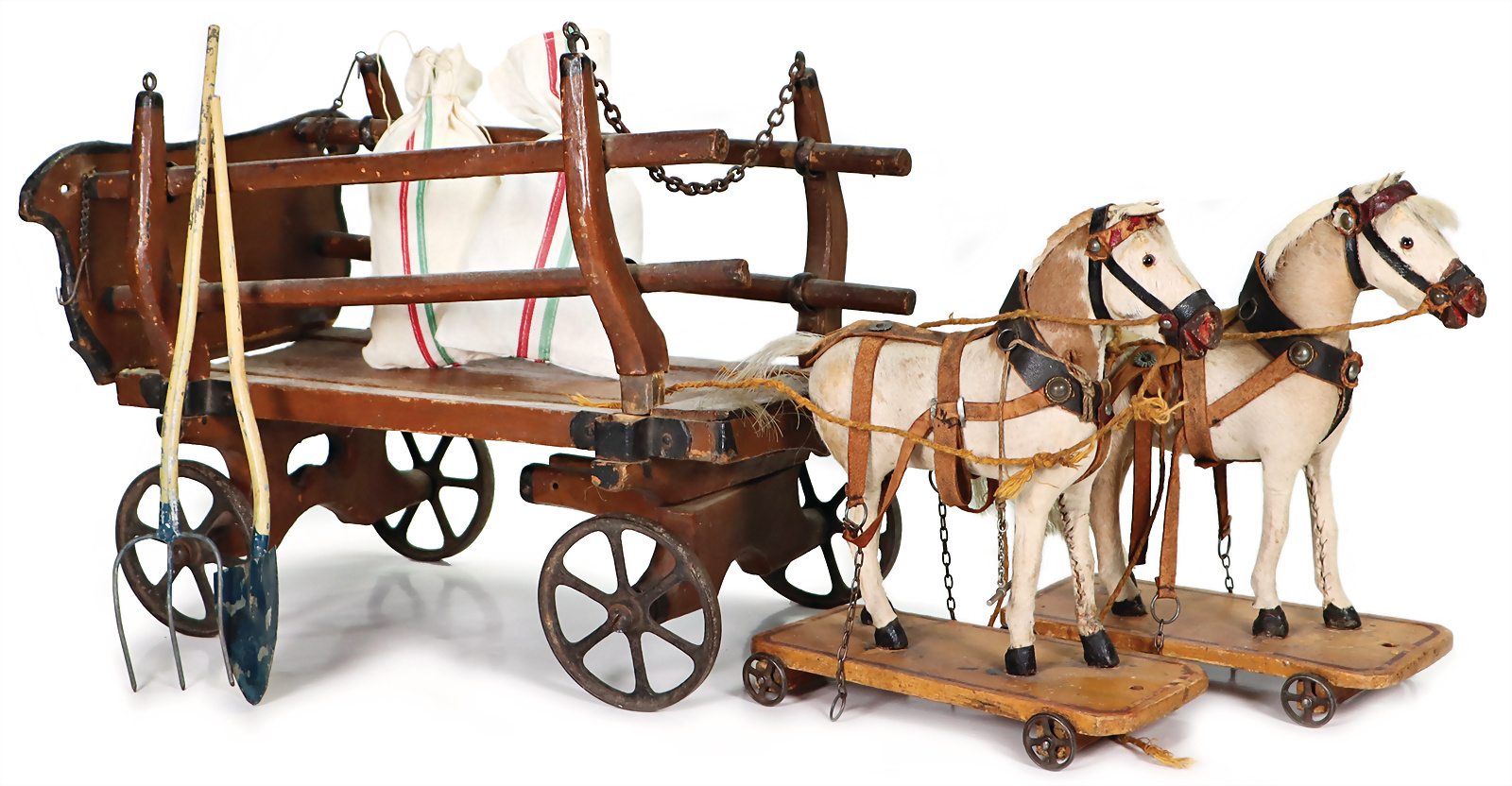 2 Zugpferde mit Leiterwagen, ca. 1890, insgesamt 66 cm, ohne Deichsel