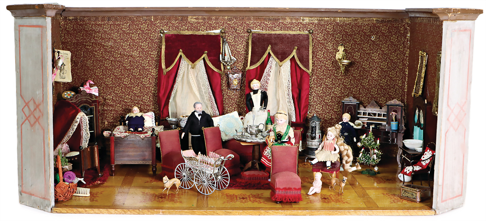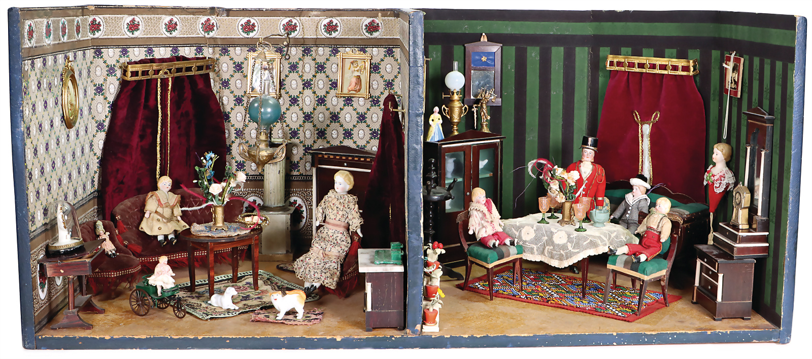 2-tlg. Puppenstube, B: 75 cm, H: 33 cm, T: 37 cm, 2 Fenster, Durchgang, mit alter Tapete neu tapeziert, eingerichtet mit Biedermeier Möbeln, hochwertiges Zubehör, Puppenstuben-Puppen, Mann mit Backenbart, Biskuit-Brustblattkopf, -Arme u. -Beine, Orig.-Kleidung, Provenienz: " Sammlung Gerda Ott "