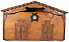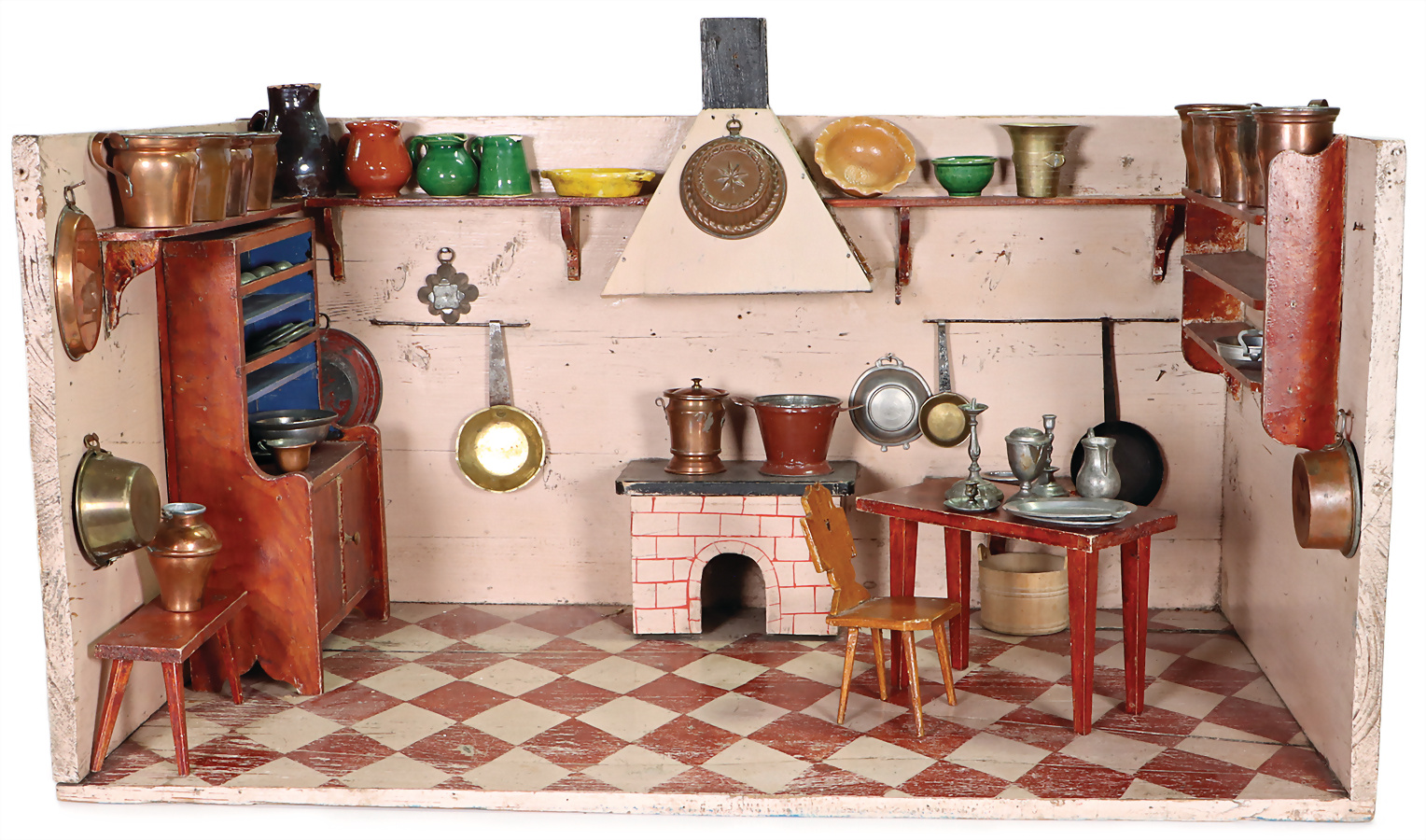 Rauchfangküche ca. 1880, B: 66,5 cm, H: 40 cm, T: 40 cm, alte Bemalung, fest eingebaute Regale, Feuerstelle, Rauchfang, einige Kupferteile, innen verzinnt, Zinnteile, Messingteile aus der Zeit,