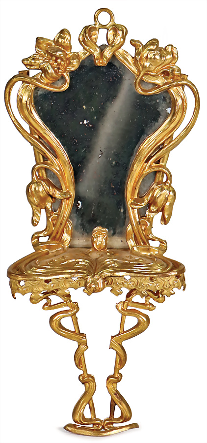 Messingblech, vergoldet, prächtiger Spiegel, für herrschaftliche Puppenstube, H: 17 cm, filigran gearbeitet, Provenienz: " Sammlung Gerda Ott "
