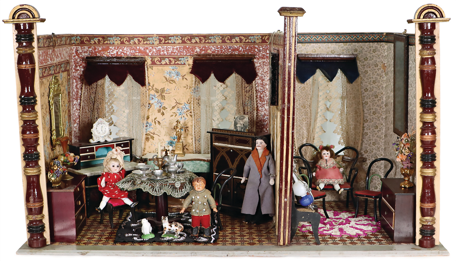 Kl. 2-tlg. Puppenstube, ca. 1890, B: 58 cm, H: 35 cm, T: 28,5 cm, alte Tapete an Wand u. Boden, alte Außenbemalung, Säulen vorne farbl. überarbeitet, mittlere Wände möglicherweise ergänzt, 3 Fenster, Durchgangstür, mit lithogr. Papier beklebt, möbliert mit Biedermeier Möbeln, Puppenstuben-Puppen, Zubehör, dekorativ, Provenienz: " Sammlung Gerda Ott "