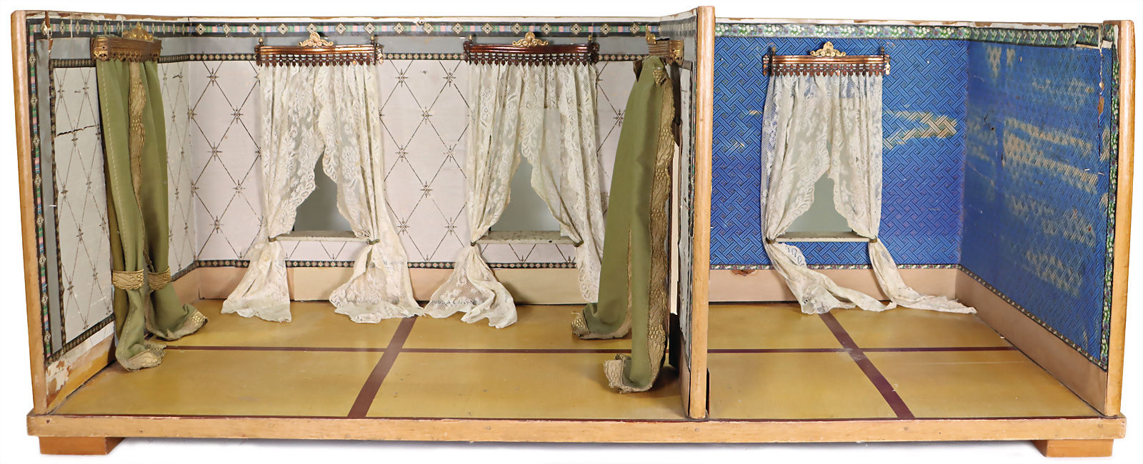 Biberacher Blech, 2-tlg. Puppenstube, B: 102 cm, T: 49 cm, H: 39 cm, 3 Fenster, Durchgang, Ausgang zum Anbringen eines Wintergartens, ohne Glasscheiben, ROCK & GRANER Vorhangblenden, alte Tapete, Orig.-Bodenbemalung, bitte Transportaufwand beachten, Provenienz: " Sammlung Gerda Ott "