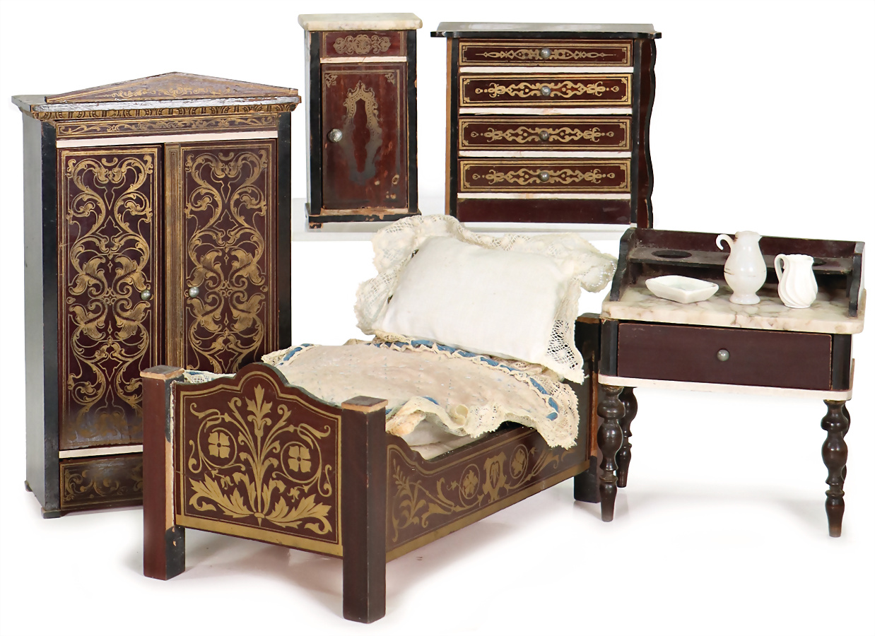 Puppenstuben-Schlafzimmermöbel, mit Boulle Ornamenten, Kleiderschrank, 17,5 cm, Damensekretär, Kommode, Bett, L: 18,5 cm, Nachttisch, Marmorplatte gebrochen, 1 Stuhlbein des Damensekretärs liegt lose bei, Provenienz: " Sammlung Gerda Ott "