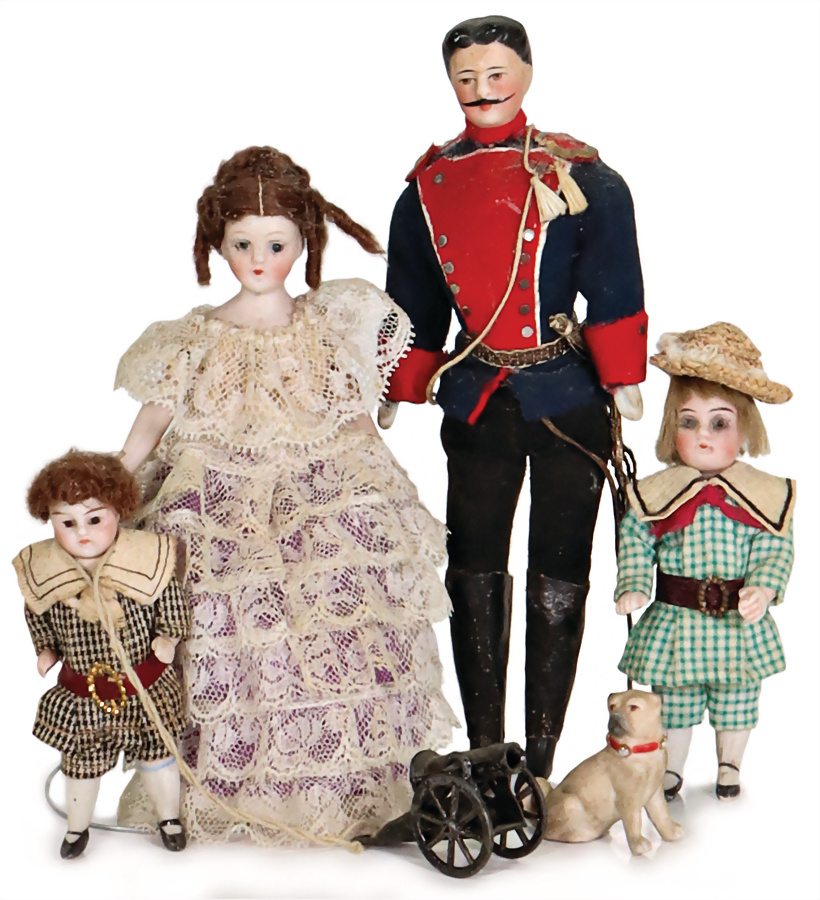 Puppenstuben-Puppen, Dame, 14 cm, Porzellan-Brustblattkopf, fest einges. Glasaugen, Perücke, Stoffkörper, Kleidung aus alten Stoffen genäht, Mann, Soldat mit Schnurrbart, 18 cm, Porzellan-Brustblattkopf, -Arme u. -Beine, Stoffkörper, Orig.-Kleidung, 2 Puppenstubenpuppen Kinder, Ganzbiskuit, Orig.-Kleidung, kl. Biskuit-Hund, Provenienz: " Sammlung Gerda Ott "