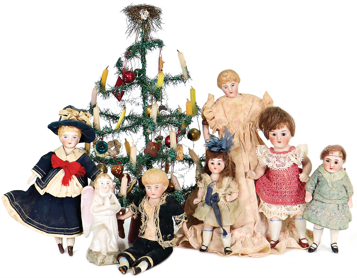 Puppenstubenpuppen, 3 Kinder, Ganzbiskuit, 2 Kinder Biskuit-Brustblattkopf, -Arme u. -Beine, Stoffkörper, Dame, 15,5 cm, Biskuit-Brustblattkopf, -Arme u. -Beine, Stoffkörper, kl. Biskuit-Engelsfigur, Weihnachtsbaum, geschmückt, H: 22 cm, Provenienz: " Sammlung Gerda Ott "
