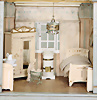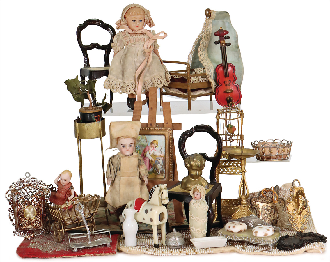 Puppenstuben-Ausschmückungsteile, 2 Stühle, ROCK & GRANER, Biberacher Blech, 10 cm, Vogelkäfig, ERHARDT & SÖHNE, Messingblech, vergoldet, Vogelkäfig mit kl. Wachsvogel, 6 cm, Ganzbiskuit-Puppenstuben-Puppe, Bett, Zubehörteile, Provenienz: " Sammlung Gerda Ott "