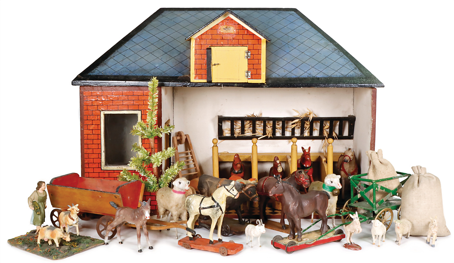 Stall, ca. 1890, B: 48 cm, H: 35 cm, T: 33,5 cm, Backsteinmuster, mit lithogr. Papier beklebt, seitl. Raum, Pferdeställe, Doppelflügeltür, im hinteren Bereich, seitl. zum Öffnen, 1 Türflügel möglicherweise ergänzt, reichh. Zubehör, Provenienz: " Sammlung Gerda Ott "