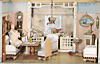 2-tlg. Manufaktur Puppenstube, mit Erker, B: 62 cm, H: 27,5 cm, T: 38,5 cm, alte Tapete an Wand u. Boden, Durchgangstür, alte Vorhänge, möbliert, teilw. mit GOTTSCHALK Möbeln, einige Teile ERHARDT & SÖHNE, Messingblech vergoldet, Puppenstuben-Puppen, schöne Gr., schöner Orig.-Zust., Provenienz: " Sammlung Gerda Ott "