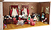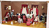 Puppenstuben-Wohnzimmer, B: 98 cm, H: 38,5 cm, T: 49 cm, alte Bemalung, schöne Bodenbemalung, alte Tapeten, möbliert, mit Boulle u. Biedermeier Möbeln, Puppenstuben - Puppen, schönes Zubehör, 1 Fenster liegt lose bei, ca. 1890