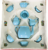 Puppen-Kaffeeservice, Blech, emailliert, Kanne H: 11,5 cm, Zuckerdose, Milchkanne, 6 Tassen mit Untertasse, im Orig.-Kart.