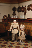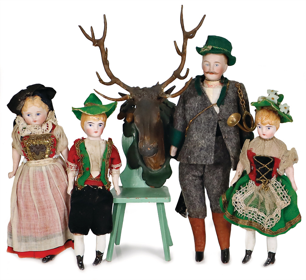 Konv. Puppenstuben-Ausschmückungsteile, für Jägerstube, Hirschgeweih, 12-Ender, Holz geschnitzt, H: 15 cm, Jäger, Biskuit-Brustblattkopf, anmodell. Schnurrbart, Porzellan-Arme u. -Beine, Stoffkörper, Orig.-Filzkleidung, mit Zinngewehr, Frau mit Trachtenkleidung, 14 cm, 2 Kinder, Provenienz: " Sammlung Gerda Ott "