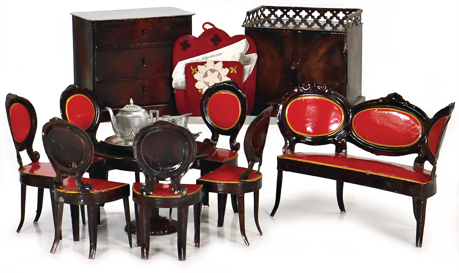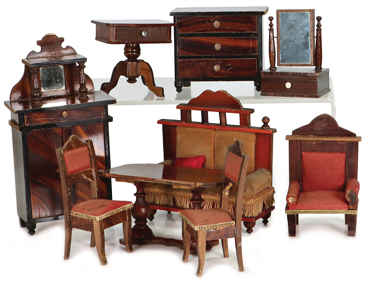 Puppenstuben-Möbel, Wohnzimmer, Biedermeier Kippspiegel mit Schublade, 8,5 cm, Sitzgruppe, Tisch, untere Platte 1 Teil weggebrochen, Stühle, Sofa, Sessel, 1 Fuß liegt lose bei, Nähtisch, Kommode, Provenienz: " Sammlung Gerda Ott "