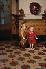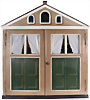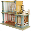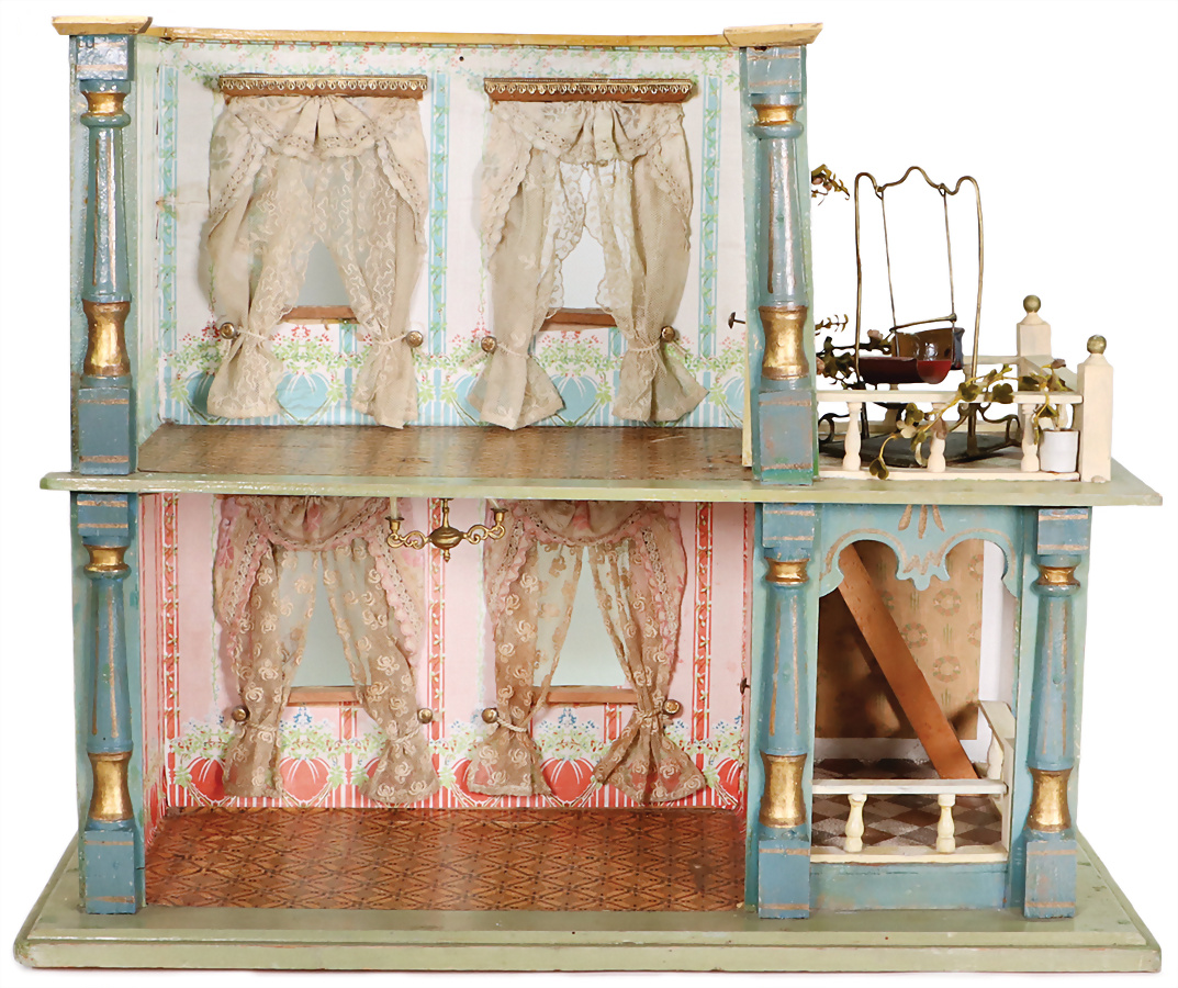 Kl. Doppelpuppenstube, mit Terrasse u. Wintergarten, H: 42,5 cm, B: 51 cm, T: 21 cm, alte Tapete an Wand u. Boden, Säulenbemalung später, schöne Gr. dekorativ, mit Treppe, Fensterscheiben fehlen, mit kl. Blechschaukel, Provenienz: " Sammlung Gerda Ott "
