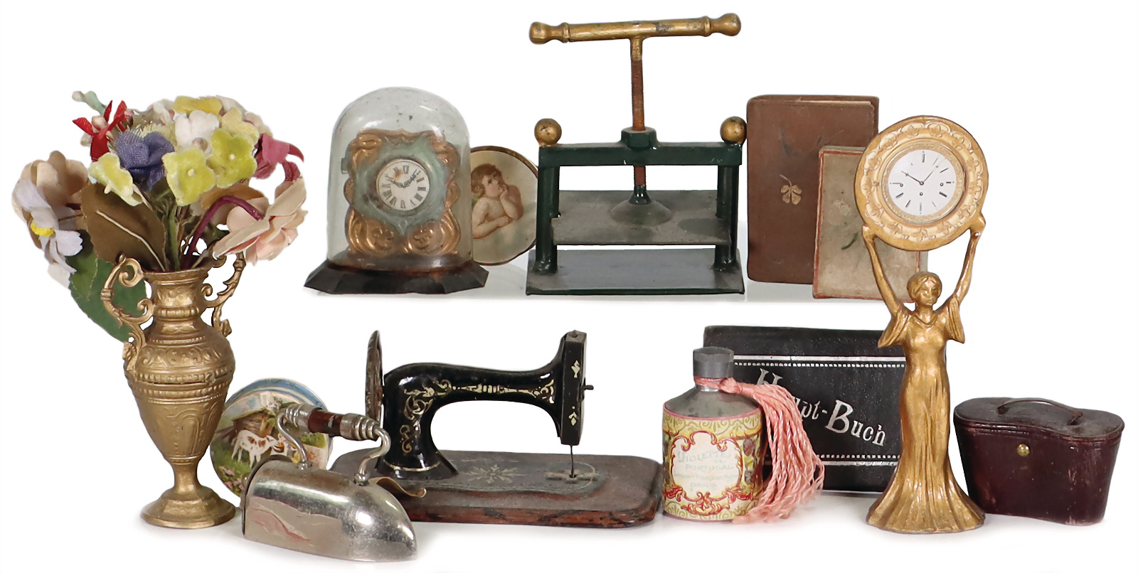 Konv. Puppenstuben-Ausschmückungsteile, Bügeleisen als Maßband, 5,5 cm, kl. Nähmaschine, Blech, lithogr., Jugendstilspiegel mit Figur, Kaminuhr, Kleinteile, Provenienz: " Sammlung Gerda Ott "