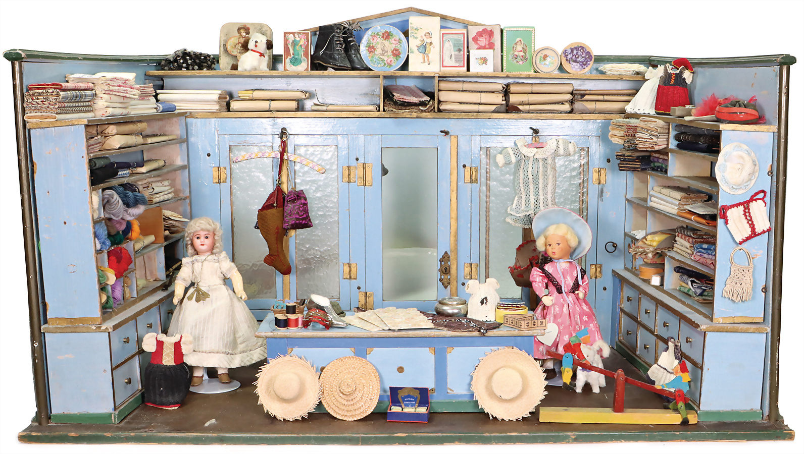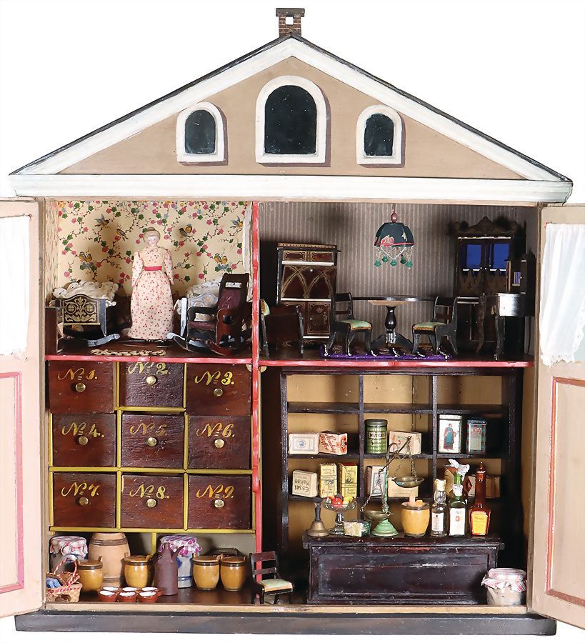 Kl. Puppenstubenhaus mit integriertem Kaufladen oder Modeladen, H: 77 cm, B: 66 cm, T: 31 cm, ca. 1890, möbliert mit schönen Boulle-Möbeln, 1 Schublade, Kaufladenteile u. Puppe, alte Bemalung, bitte Transportaufwand beachten, Provenienz: „ Sammlung Gerda Ott"