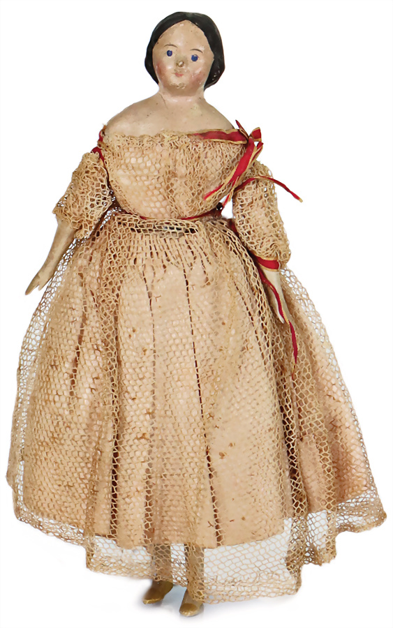 Papiermaché-Brustblattkopf-Puppe, ca. 1850, 23 cm, einges. Glasaugen, geschl. Mund Orig.-Perücke, Gliederkörper mit einzeln abgenähten Fingern, Orig.-Kleidung, Orig.-Frisur, passend zu frühem Puppenhaus oder herrschaftlicher, früher Puppenstube