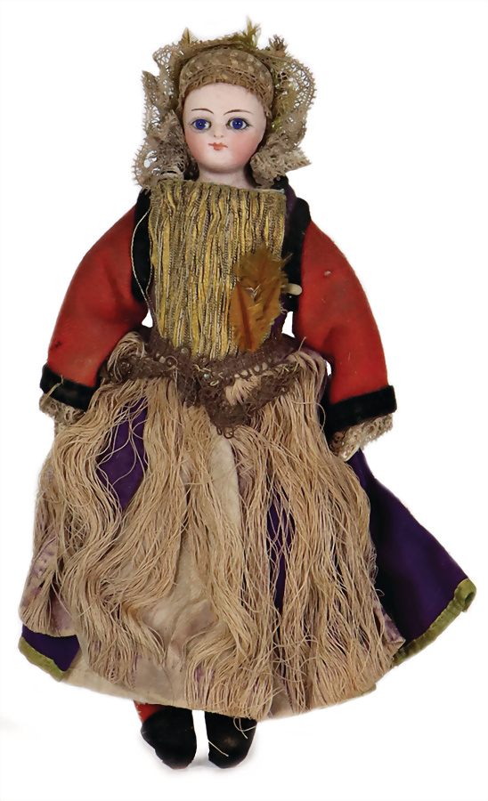 Puppenstuben-Puppe, mit Trachtenkleidung, wohl SIMON & HALBIG, Porzellan-Brustblattkopf, fest einges. Glasaugen, geschl. Mund, Lederkörper, ca. 1880, 20 cm