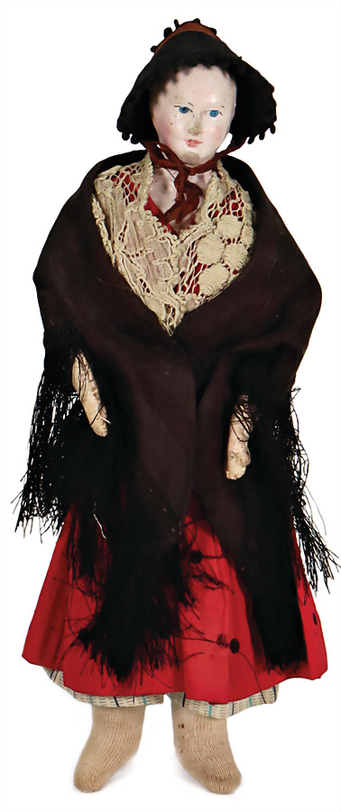 Biedermeier, Papiermaché-Brustblattkopf-Puppe, 21 cm, gemalte Augen, ausmodell. Haare, Lederkörper, Holzarme u. -beine, Nasenspitze etwas berieben, Brustblatt seitl. etw. aufgeplatzt, schöne Orig.-Kleidung, Deko für frühe Stube oder Küche
