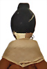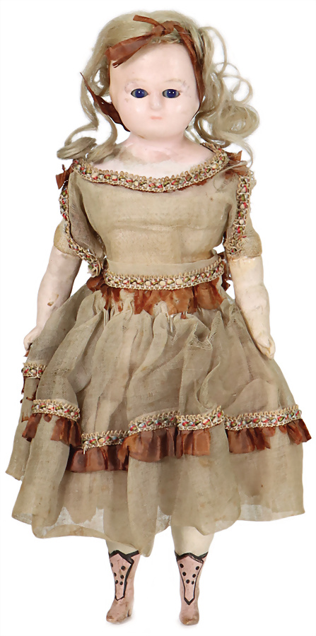 Wachs überzogene Papiermaché-Brustblattkopf-Puppe, 25 cm, Mohair, Schlafaugen, Stoffkörper, Masse-Arme u. -Beine, ausmodellierte Stiefel, schöne Orig.-Kleidung
