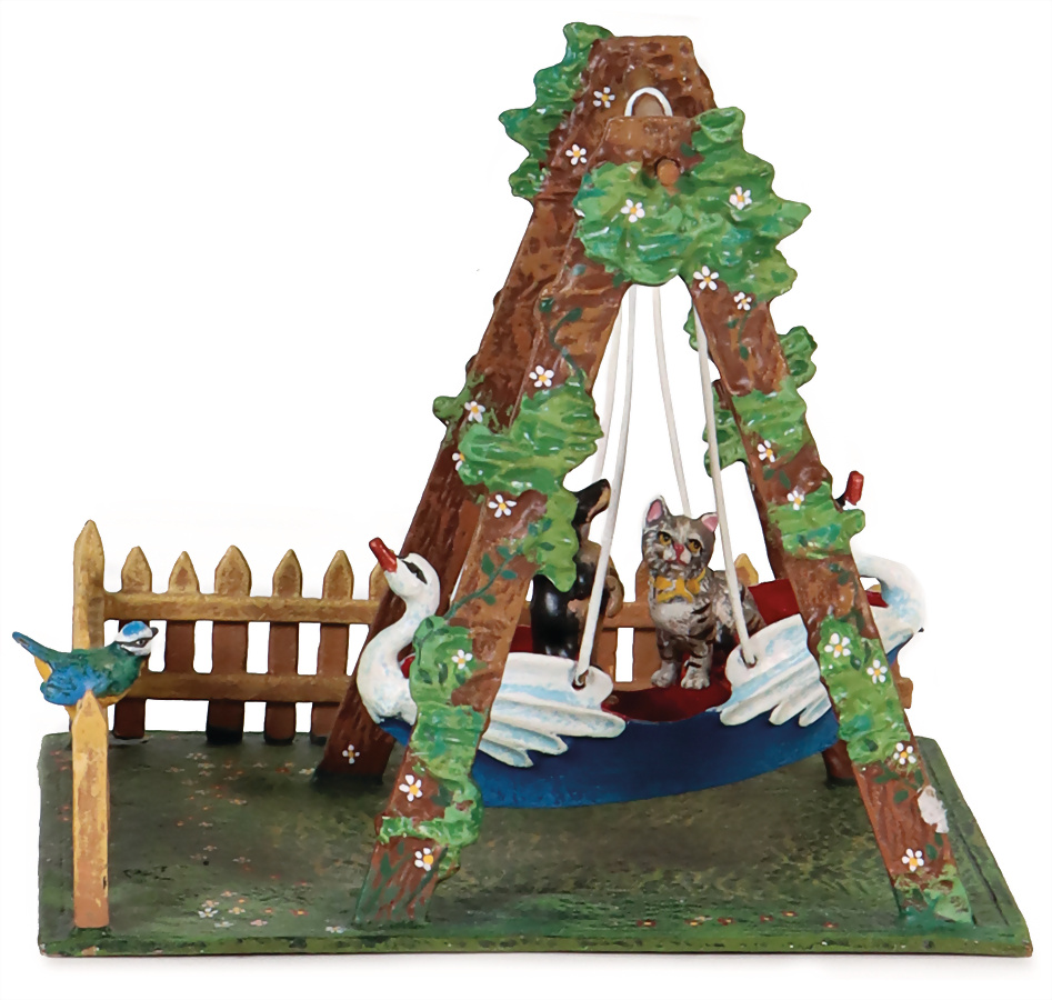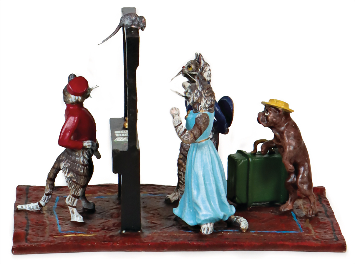 Wiener Bronze, Hund u. Katze in der Schwanenschaukel, feine Bemalung, H: 9,5 cm, sehr guter Zust.