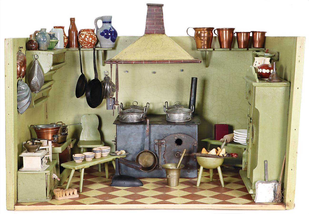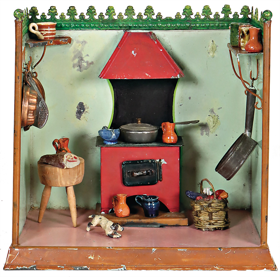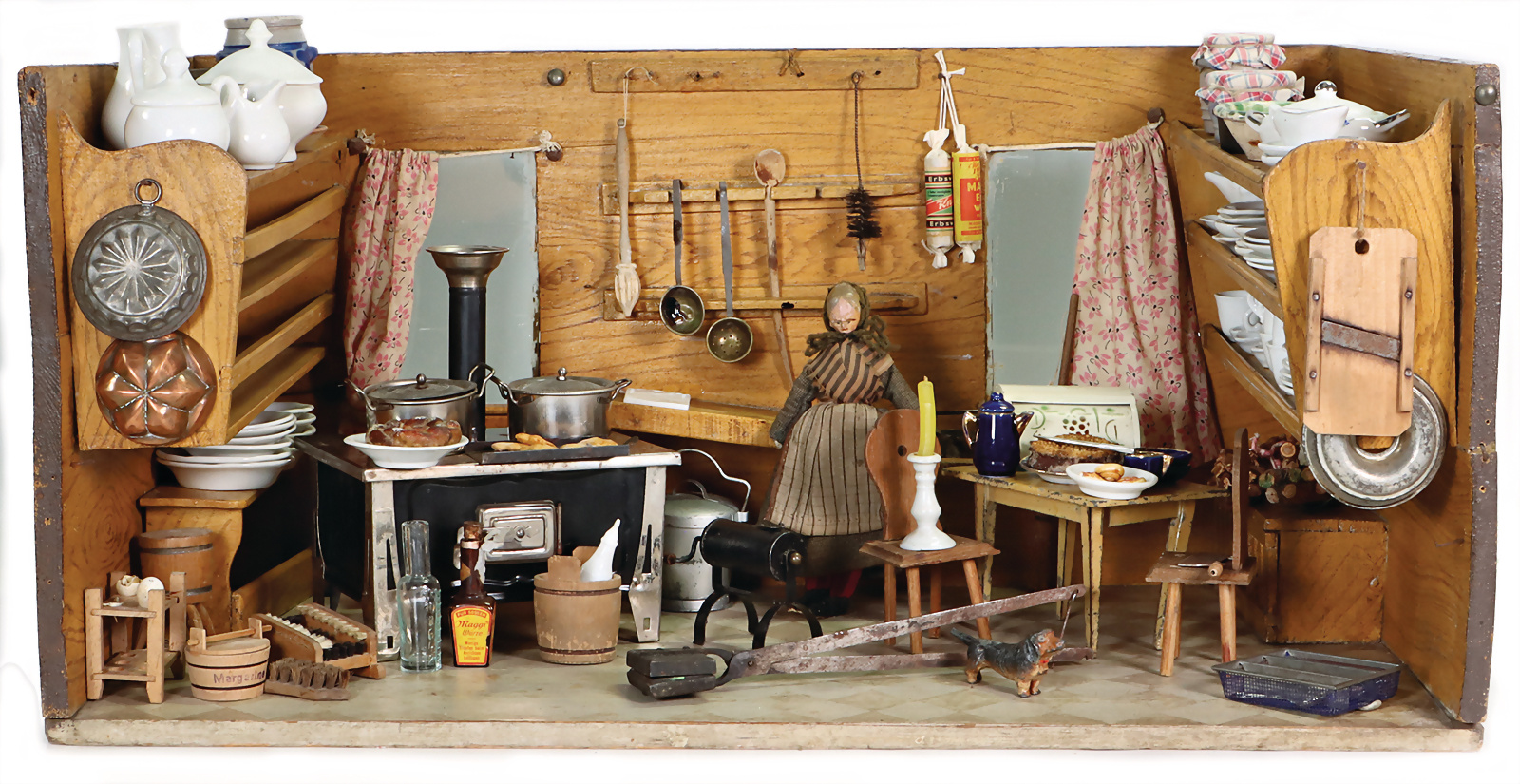 Kl. Puppenstuben-Küche, ca. 1880, B: 65 cm H; 28cm T: 33,5 cm, fest eingebaute Regale, Gänsestall, alte Bemalung, reichh. Zubehör, Zinn, Kupfer, Blech, Provenienz: „ Sammlung Gerda Ott"