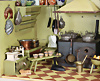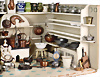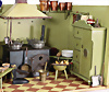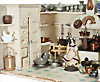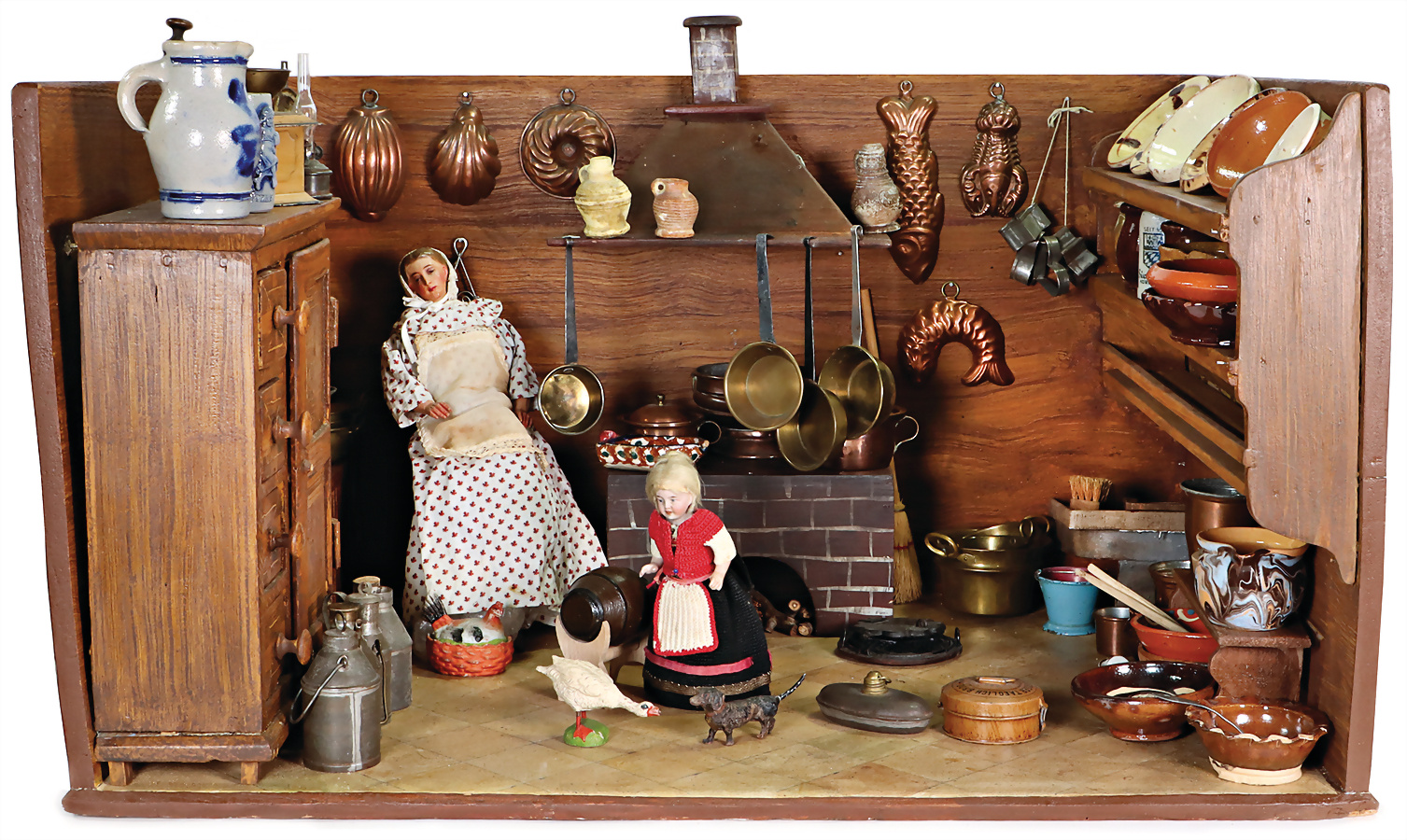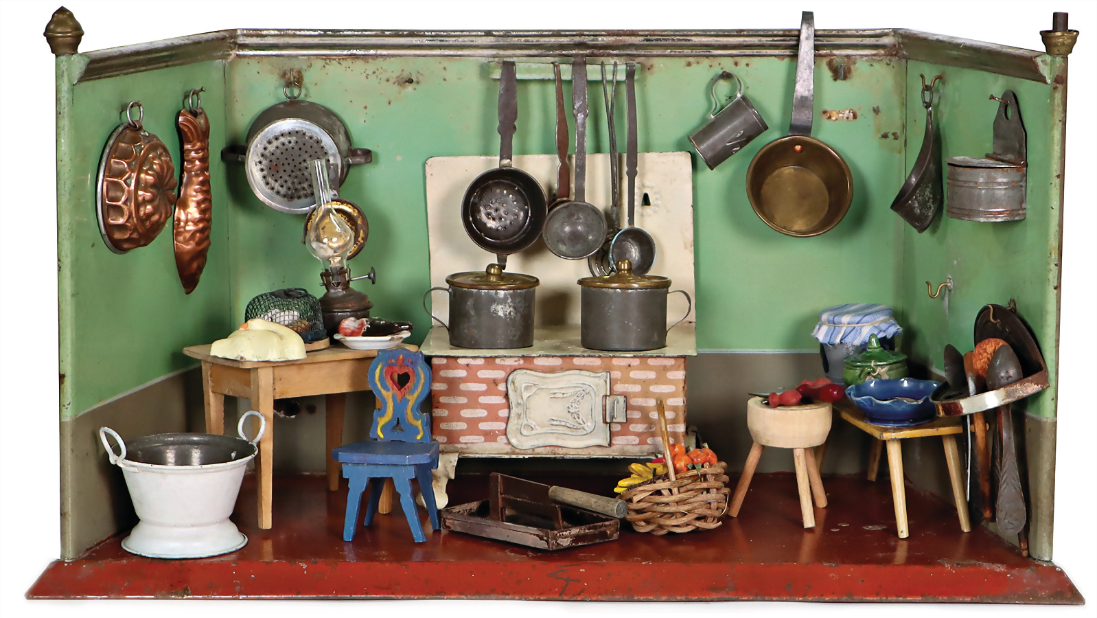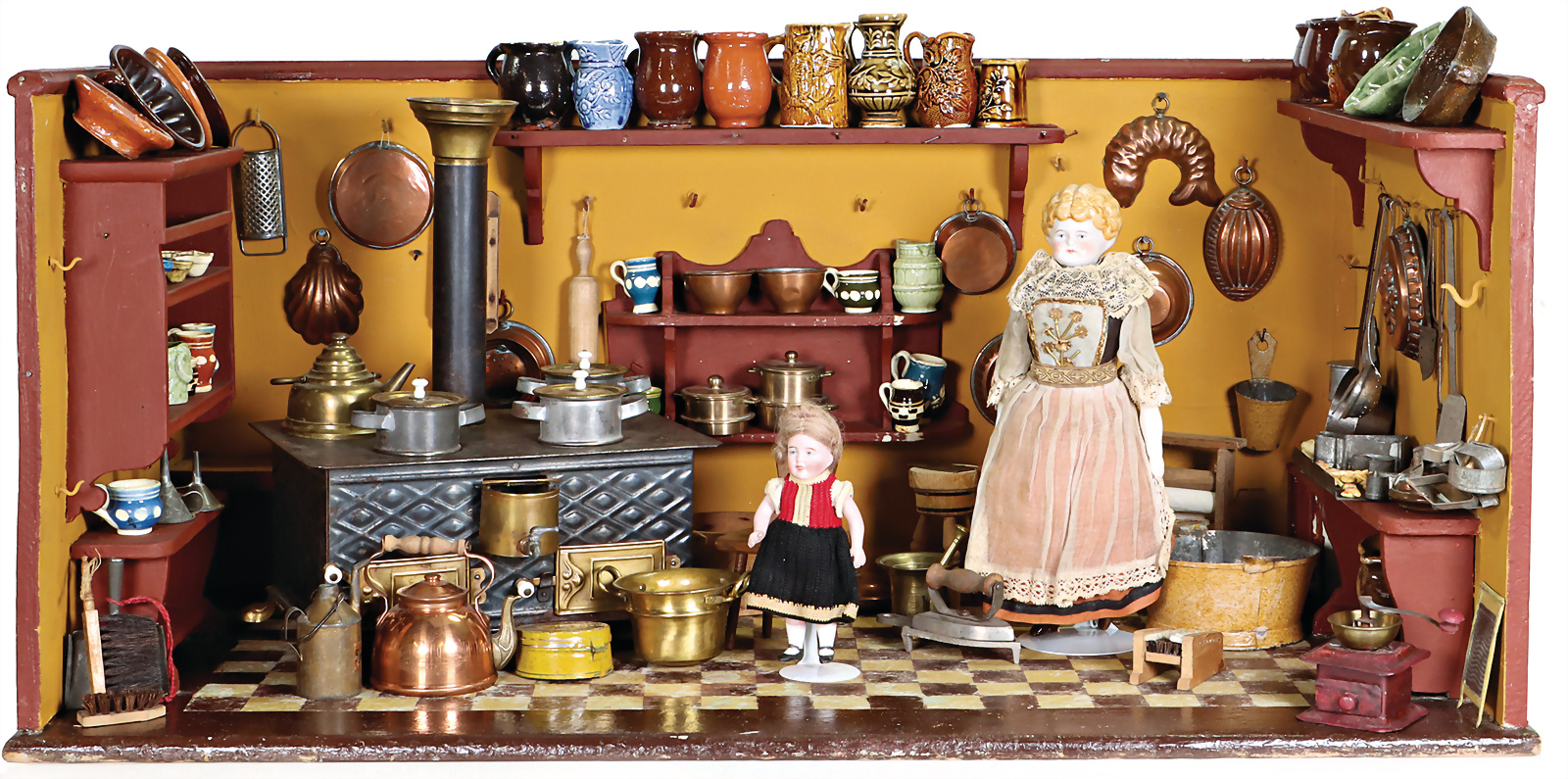 Kl. Puppenstuben-Küche, ca. 1880, B: 65 cm H; 28cm T: 33,5 cm, fest eingebaute Regale, Gänsestall, alte Bemalung, reichh. Zubehör, Zinn, Kupfer, Blech, Provenienz: „ Sammlung Gerda Ott"