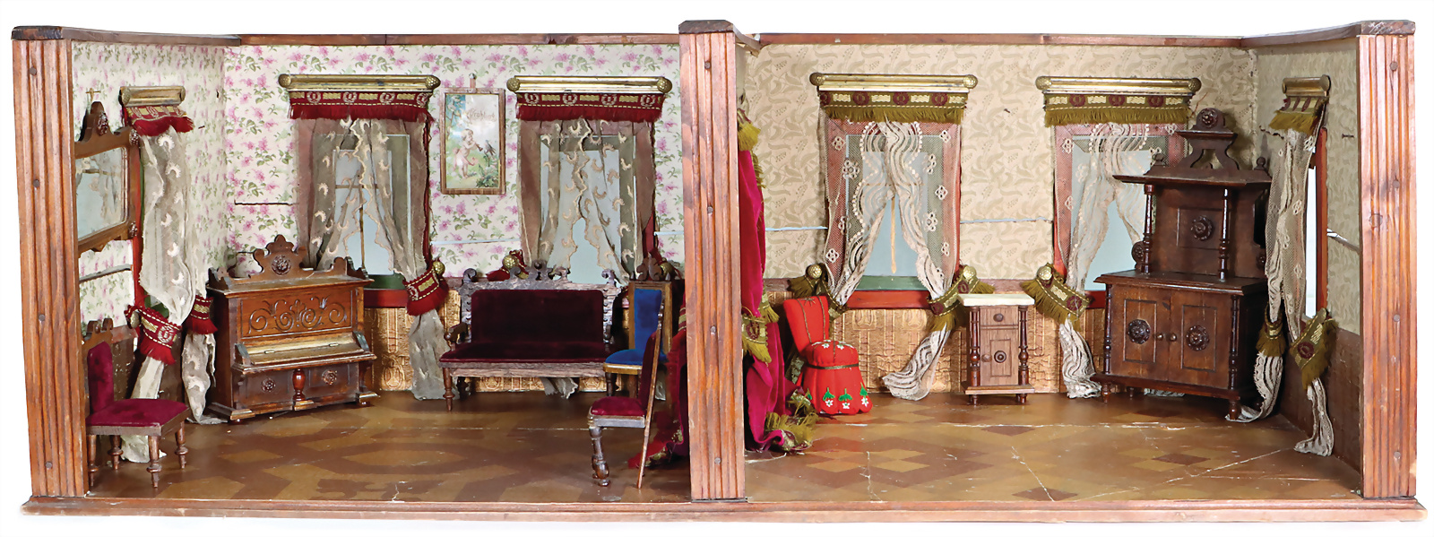 2-tlg. Puppenstube, um 1900,B: 103 cm, H: 37 cm, 6 Fenster, Fenstergläser fehlen teilw., teils alte Tapete, möbliert, Transportaufwand beachten, besser Selbstabholer oder Spedition, Provenienz: " Sammlung Gerda Ott "