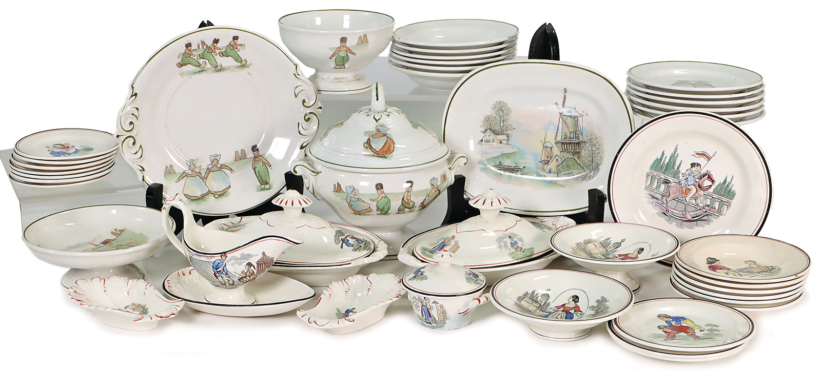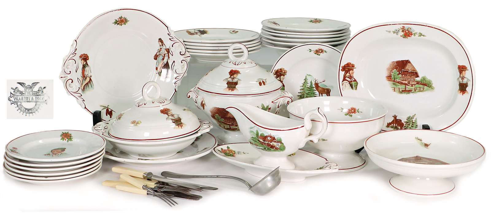 Kinder-Speise-Service, Keramik, seltenes Schwarzwaldmotiv, Suppenschüssel, Anbietschalen, Sauciere, Deckelschale, 6 flache, 6 tiefe Teller, D: 15 cm, 6 Dessertteller mit Besteckteilen, kl. Chip am Deckel der Suppenschüssel, sonst guter Zust., Provenienz: „ Sammlung Gerda Ott"