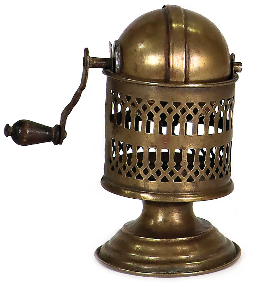 Seltener Kaffeeröster, Messingblech, H: 12 cm, mit integriertem Spiritusbrenner, Provenienz: „ Sammlung Gerda Ott"