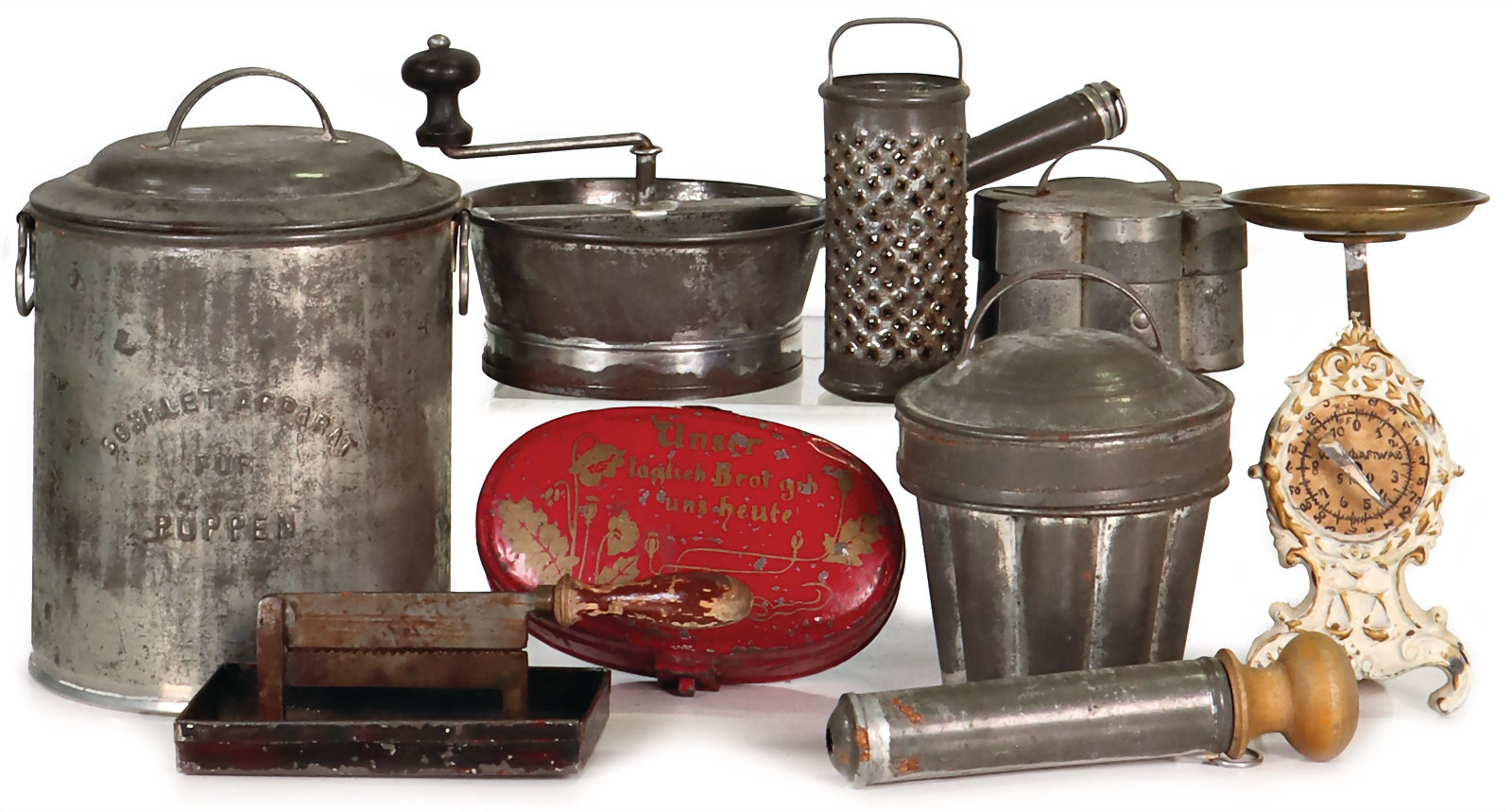 Konv. Puppenküchen-Ausschmückungsteile, Puddingform, Brotdose, Tellerwaage, Reibe, Backform, Weißblech, handgelötet, Zuckerbrecher, Teigspritze, Einmachtopf, Weißblech, dazu passende Flaschen, Orig.?, Provenienz: „ Sammlung Gerda Ott"