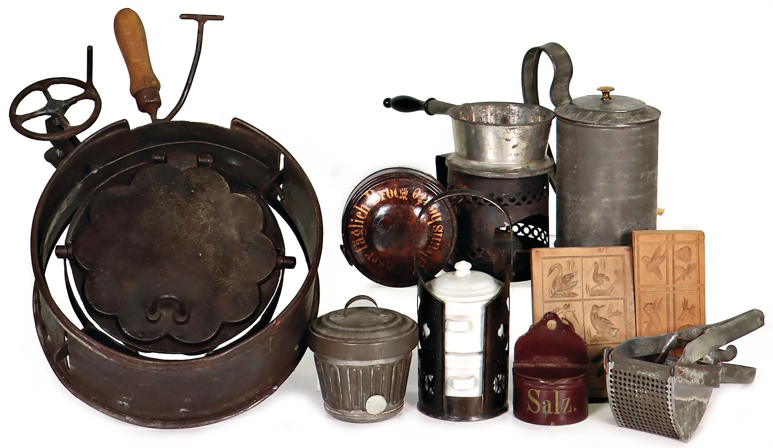 Konv. Puppenküchenteile, Kakaokocher, Deckel fehlt, Essensträger, H: 11 cm, Brotdose, Salzmetze, Kartoffelpresse, 2 Holzmodel, 1 Waffeleisenhalter, mit Höhenverstellrad, 1 Teekocher, unterer Topf fehlt, ausgefallen, Provenienz: „ Sammlung Gerda Ott"