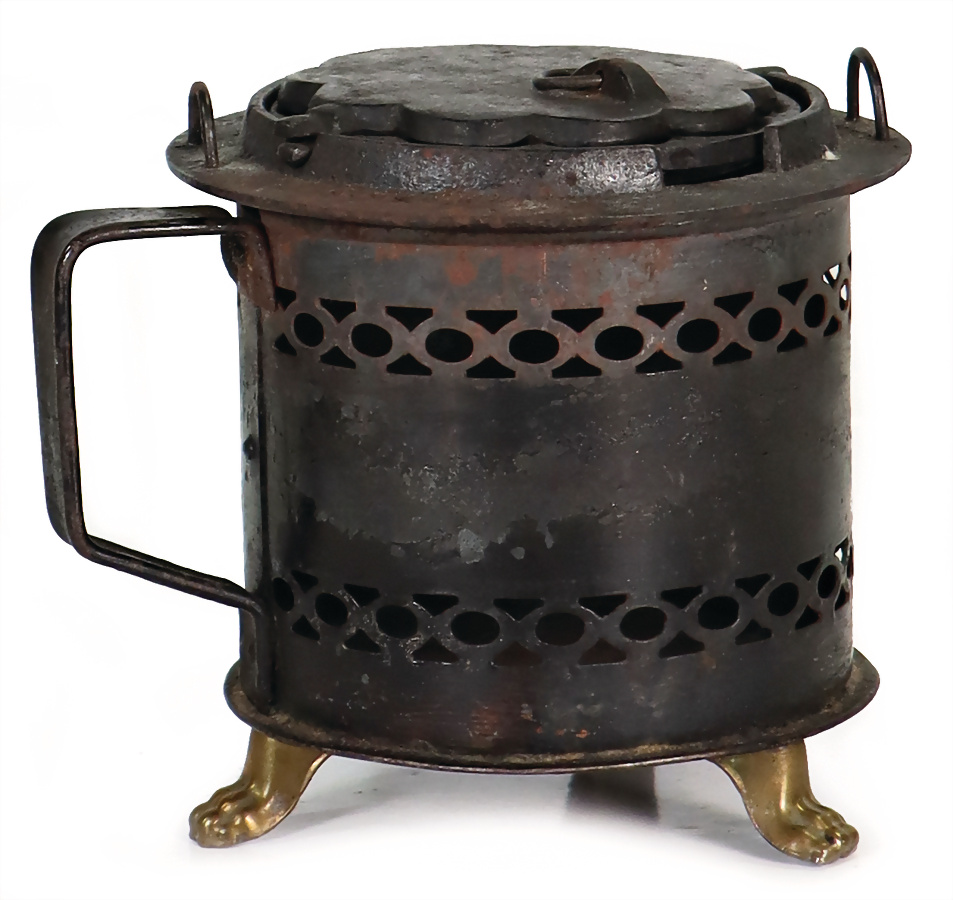 Waffeleisenkocher, Blech, H: 11 cm, Messing-Löwentatzenfüße, ohne Brenner, ausgefallen, Provenienz: „ Sammlung Gerda Ott"