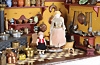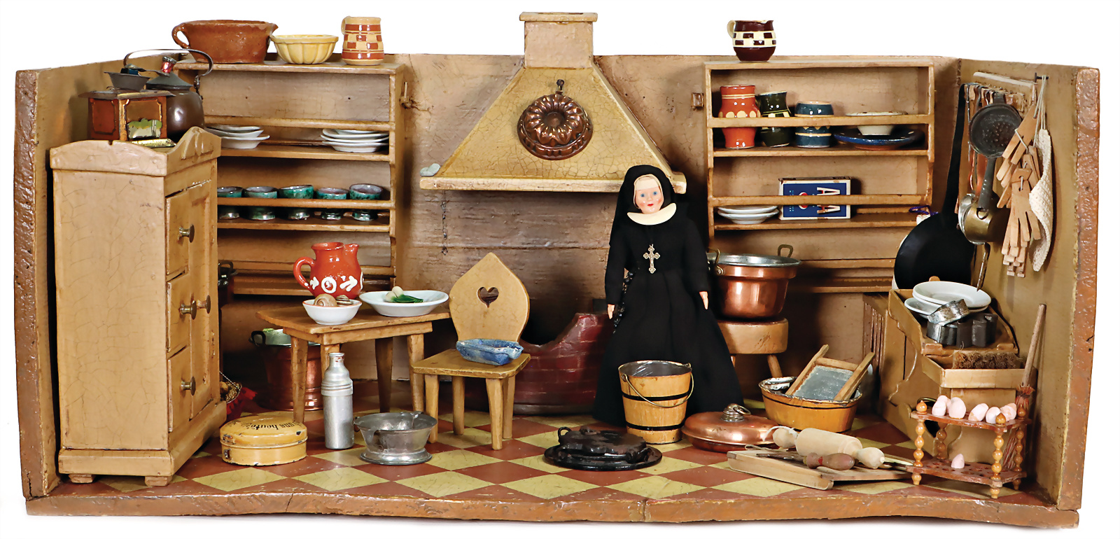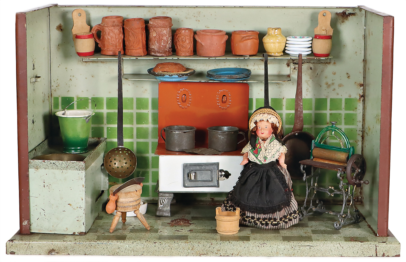 Puppenstuben-Küche, ca. 1880, Seitenwände verzapft, B: 79 cm, H35 cm, T: 44 cm, reichh. Zubehör, mit Puppe u. Herd, Bemalung innen später, fest eingebaute Regale, Waschtisch, , Provenienz: „ Sammlung Gerda Ott"