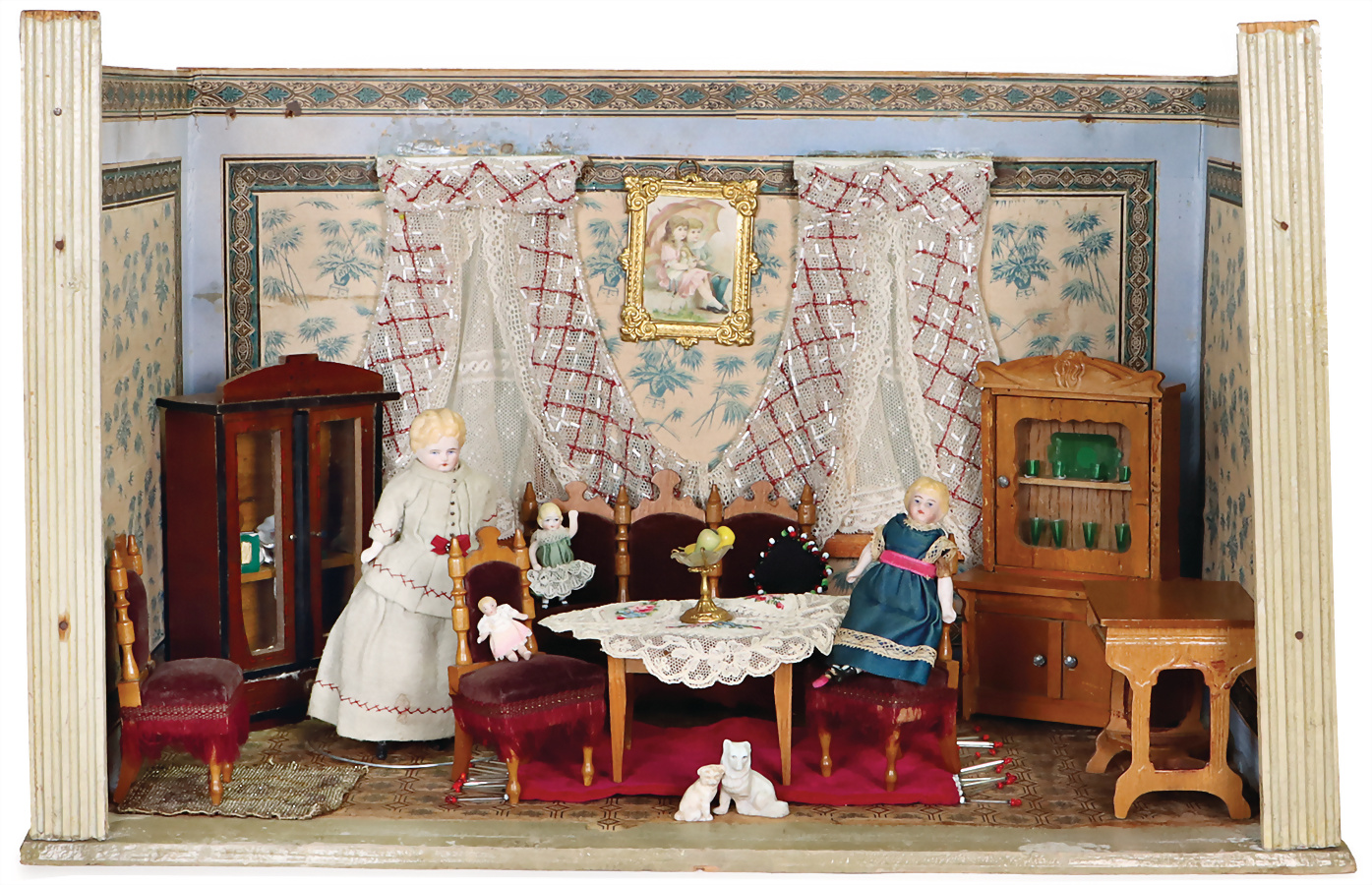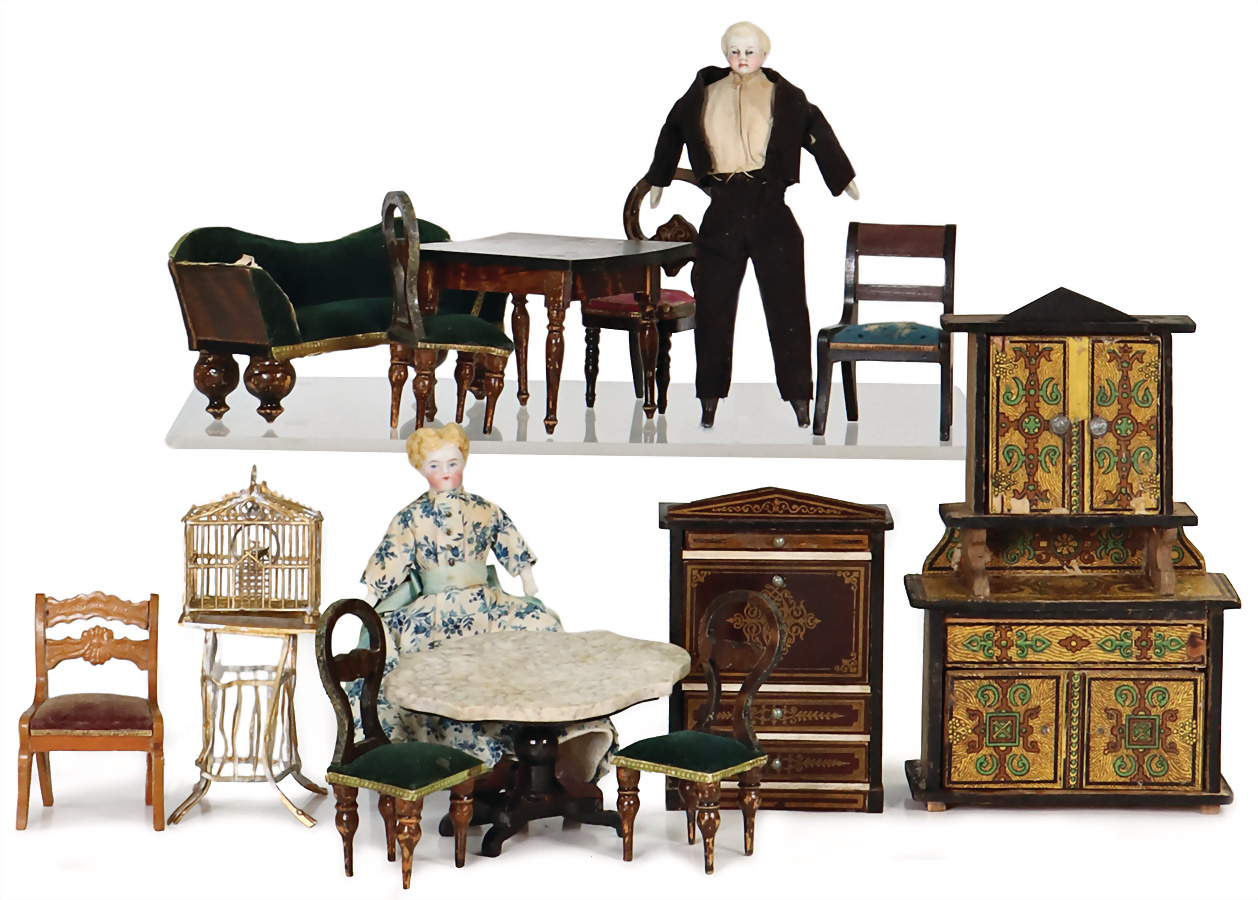 Puppenstuben-Möbel u. Ausschmückungsteile für kl. Stube, Schrank mit bunt lithogr. Papier beklebt, H: 17 cm, kl. Sekretär mit Boulle Ornamenten, H: 10,5 cm, Sofa, Stühle, 2 Puppenstuben-Puppen, Porzellan-Brustblattköpfe, -Arme u. -Beine, Stoffkörper, Provenienz: „ Sammlung Gerda Ott"