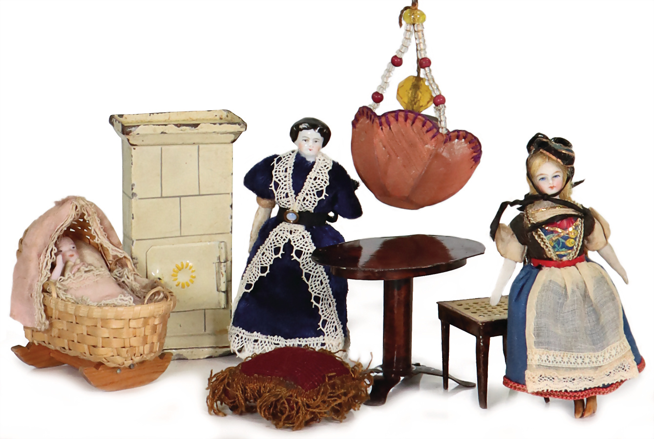 Puppenstuben-Ausschmückungsteile, Dame, 10 cm, Porzellan-Brustblattkopf, Perücke, Stoffkörper, Porzellan-Arme u. -Beine, schöne Orig.-Kleidung, kl. Biedermeier-Puppe, Kleidung aus alten Stoffen genäht, Stuhl u. Tisch, ROCK & GRANER Biberacher Blech, Tisch, 5,4 cm, kl. Puppenstuben-Ofen, Blech, handlackiert, H: 9,5 cm, Wiege mit Ganzporzellan-Kind, Deckenleuchter, Provenienz: „ Sammlung Gerda Ott"