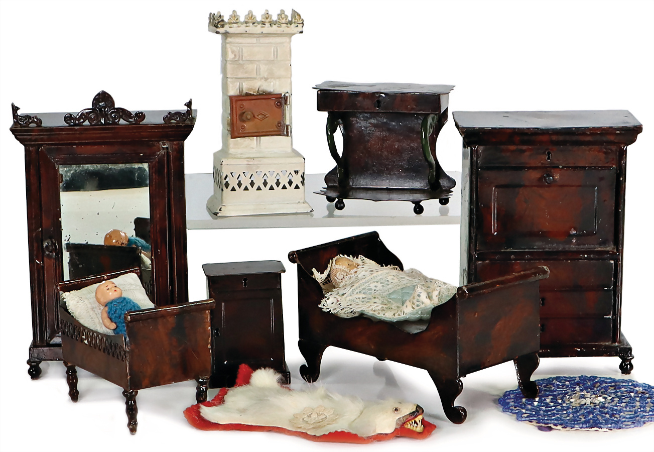 Biberacher Blech, Bett mit Nachttisch, Kleiderschrank H: 17 cm, Sekretär, Nähtisch, Kinderbett, Orig.-Zust., mit kl. Lackabplatzern, 1 Ofen, Blech, 11,5 cm, Provenienz: „ Sammlung Gerda Ott"